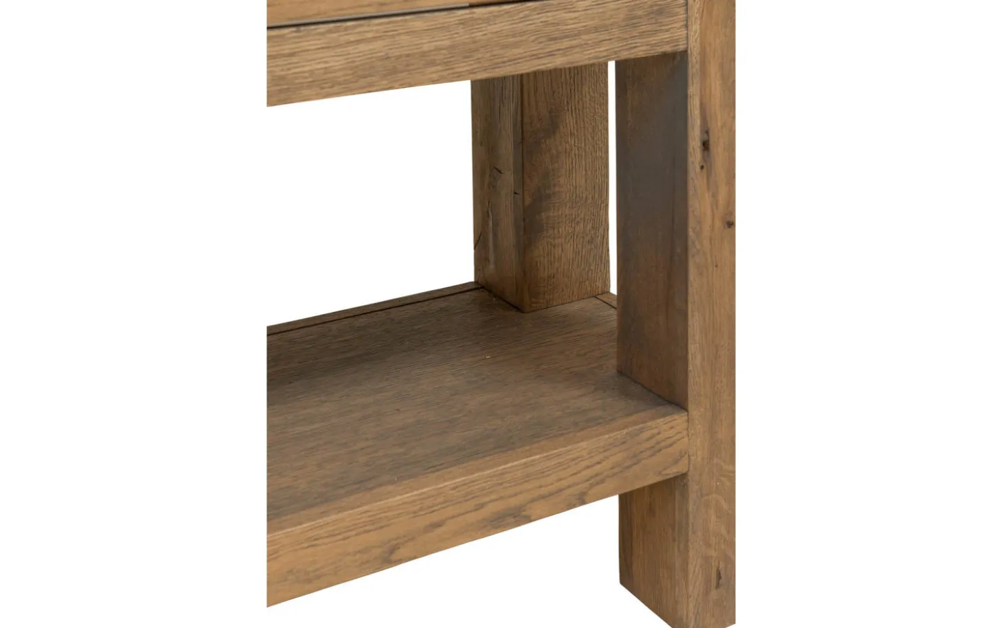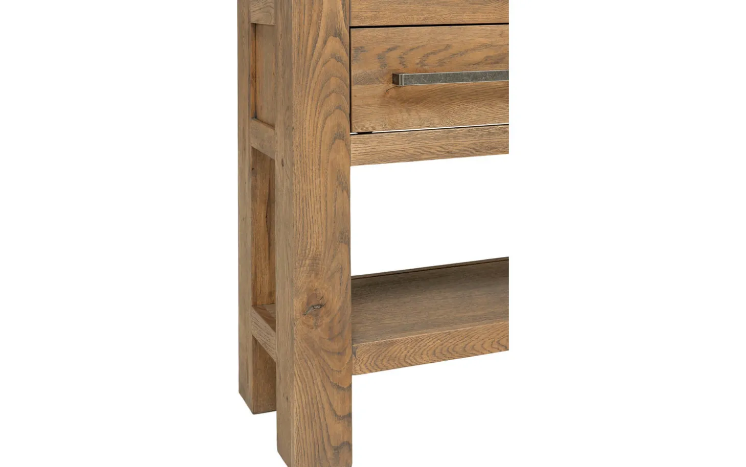 Die quadratischen Beine laufen durch die Platte hindurch, was für zusätzliche Stabilität und eine kraftvolle Formgebung sorgt. Die praktische Schublade bietet nützlichen Stauraum und hält die Platte frei für Dekoration.