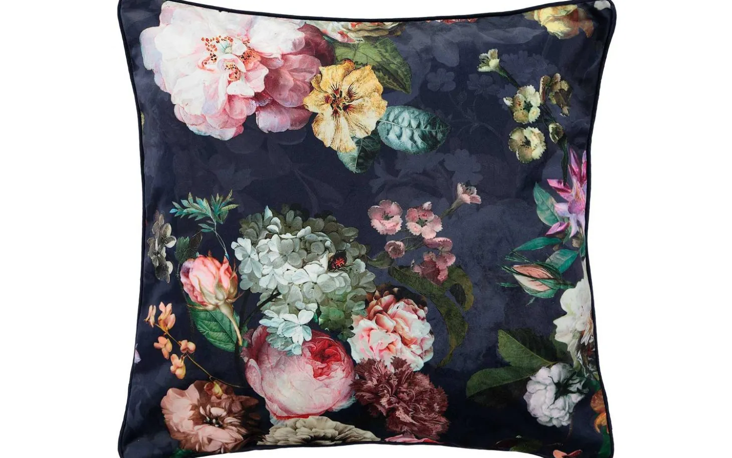 Zierkissen Fleur bringt einen fröhlichen Blumendruck in Ihr Interieur mit seinem farbenfrohen Blumenmotiv auf einem tiefen dunkelblauen Hintergrund. Dieses quadratische Kissen von 50 x 50 cm ist aus weichem Stoff gefertigt und mit einer kontrastierenden Paspel abgearbeitet, die das verspielte Design zusätzlich betont. Die Kombination aus leuchtenden Blumen vor der reichen blauen Basis sorgt für einen auffälligen Akzent, der Ihr Sofa, Ihren Sessel oder Ihr Bett sofort aufwertet.