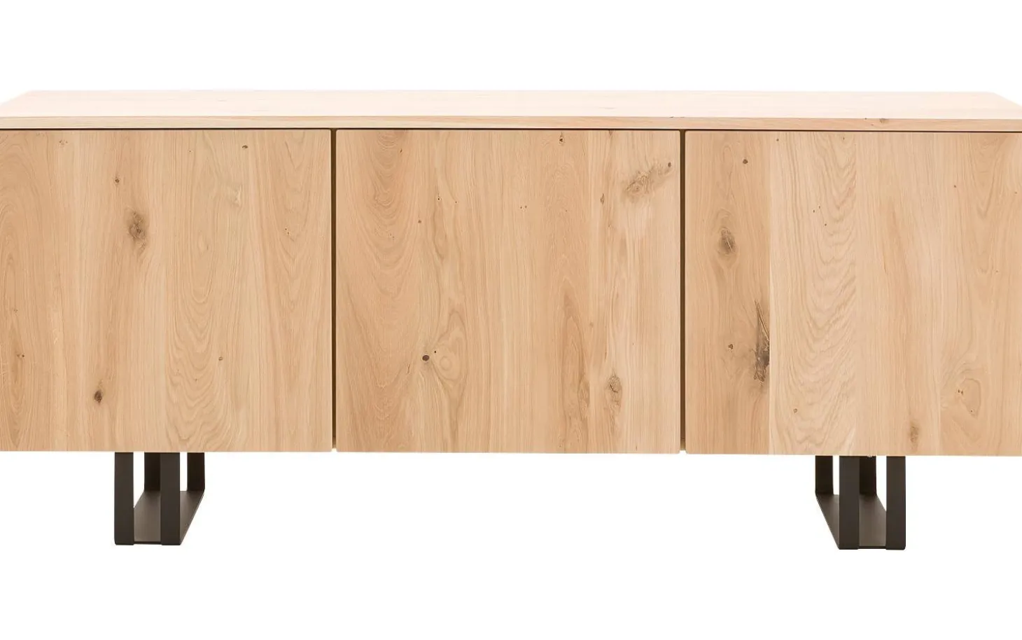 Die drei Türen des Sideboards Luuk öffnen Sie mit einem einfachen Druck, dank des cleveren Push-to-Open-Systems. Dies sorgt für eine klare, minimalistische Ausstrahlung ohne Griffe, die die reinen Linien stören würden. Die unbehandelte Eiche lässt die natürliche Holzmaserstruktur vollständig zur Geltung kommen.
