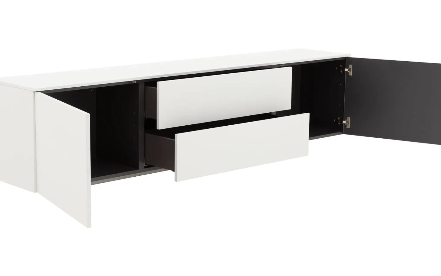 Mit seinen großzügigen Abmessungen von 224 x 49 x 41 cm bietet dieses Sideboard reichlich Stauraum. Das Innere hat keine festen Einlegeböden, sodass Sie auch größere Gegenstände problemlos unterbringen können. Die zwei geräumigen Schubladen sind perfekt für kleinere Gegenstände, die Sie ordentlich organisiert aufbewahren möchten.