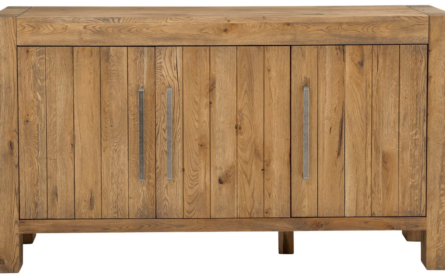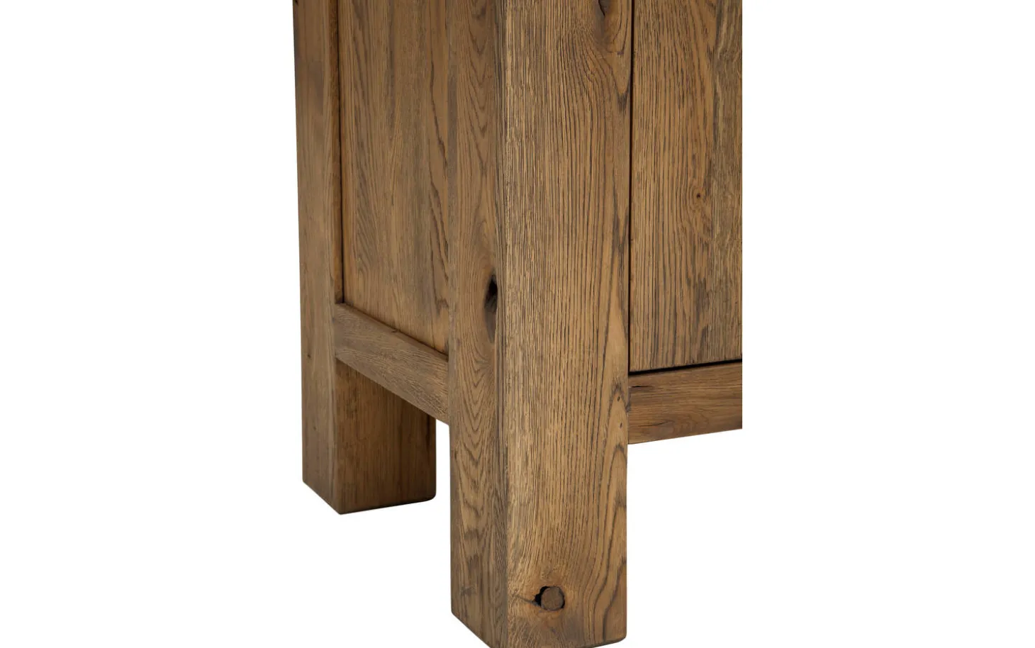 Die Metallgriffe fügen einen industriellen Akzent zum natürlichen Eichenholz hinzu. Diese durchdachte Kombination von Materialien macht das Sideboard Roots zu einem echten Blickfang, der sowohl in ländlichen als auch modernen Interieurs perfekt zur Geltung kommt.