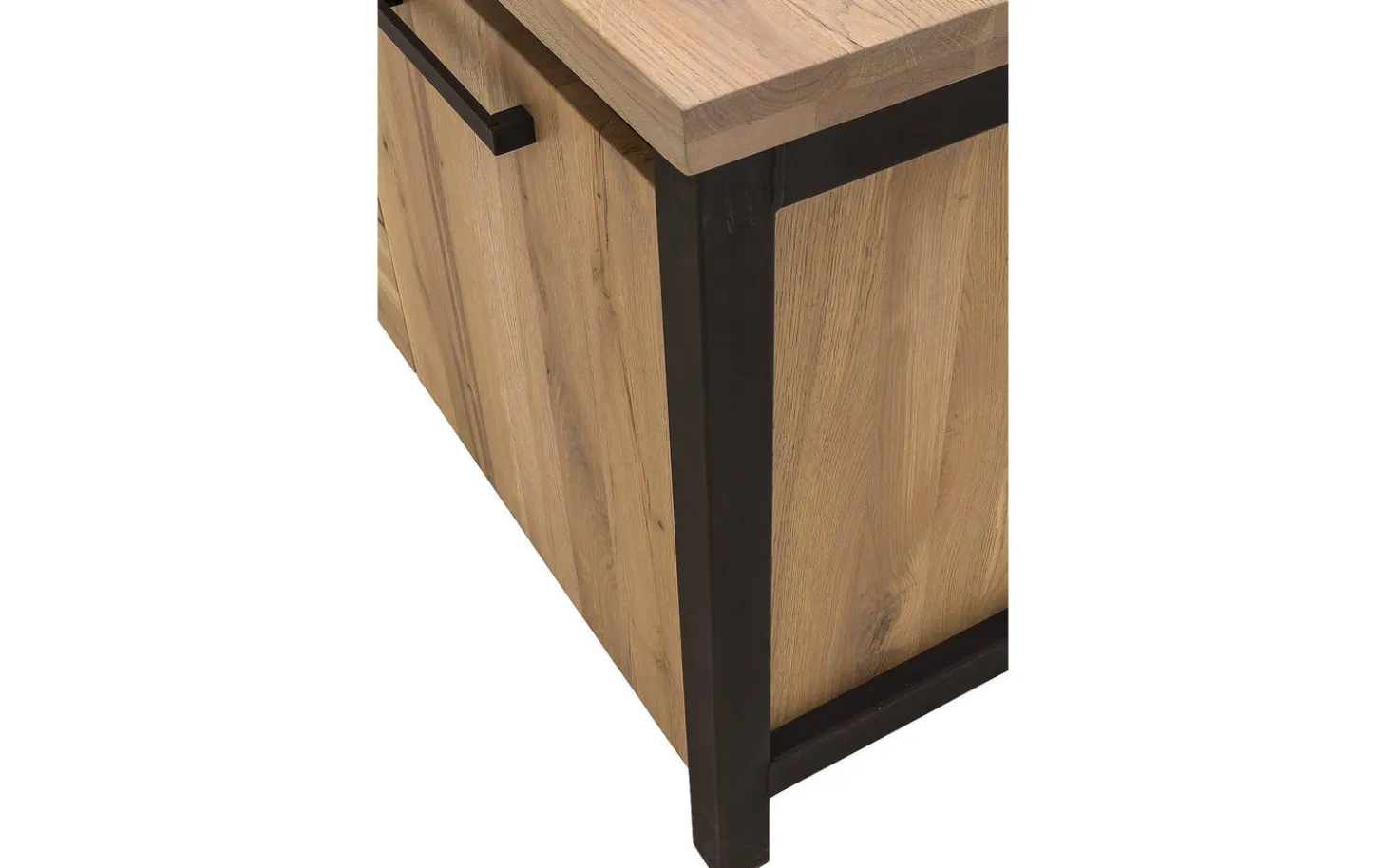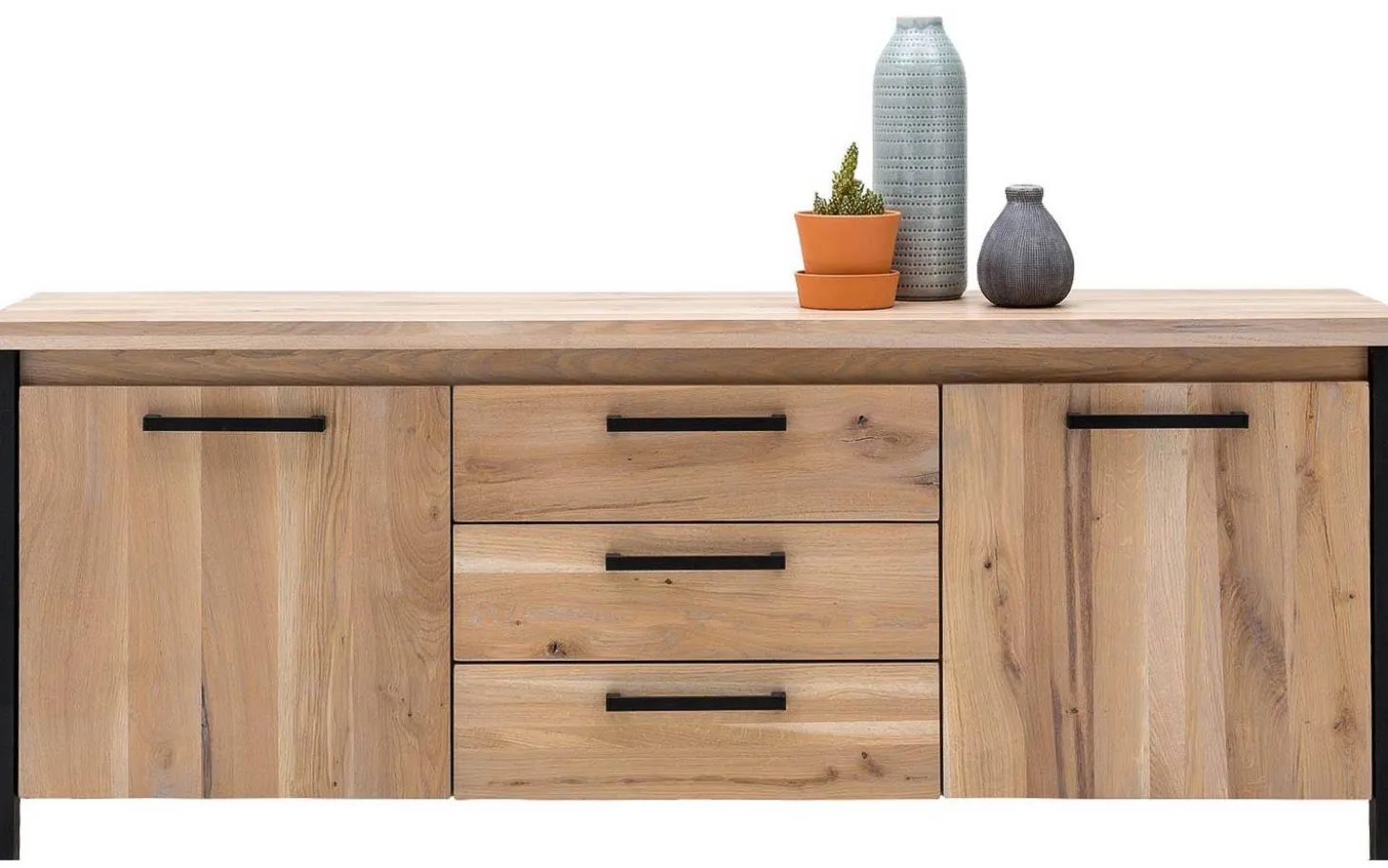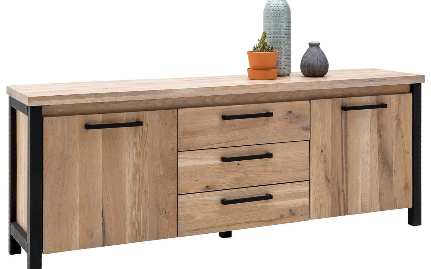 Sideboard Santos strahlt industriellen Charme aus durch die Kombination von warmem Eichenholz mit robusten schwarzen Metallakzenten. Mit seiner beeindruckenden Breite von zwei Metern wird dieses Sideboard zu einem Statement in jedem Raum. Die Ölbehandlung erhält die natürliche Holzstruktur und verleiht eine warme, authentische Ausstrahlung.