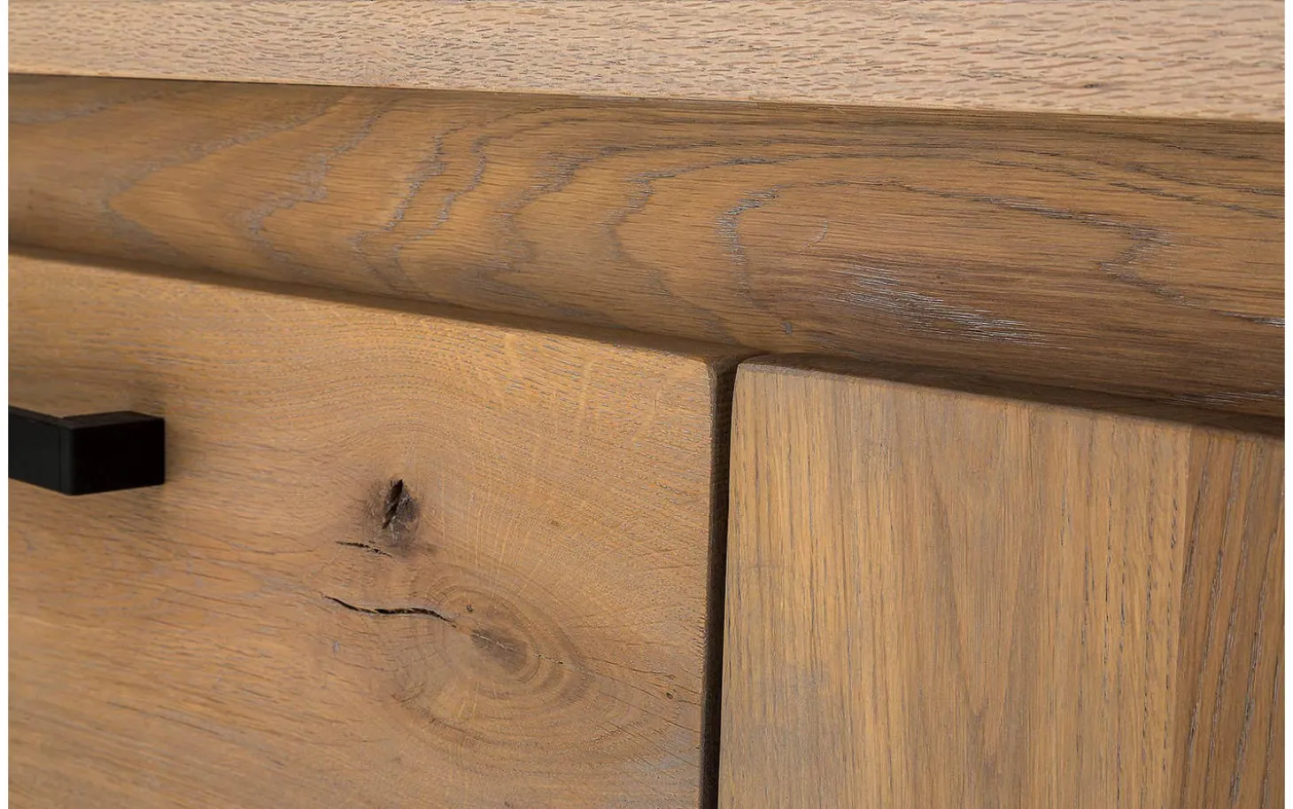 Das Eichenholz ist mit einem schützenden Öl behandelt, das Ringe und Flecken verhindert, während die natürliche Ausstrahlung erhalten bleibt. Die zwei Türen und drei Schubladen sind mit einem Soft-Close-System ausgestattet, wodurch alles sanft und geräuschlos schließt. Praktisch und stilvoll.