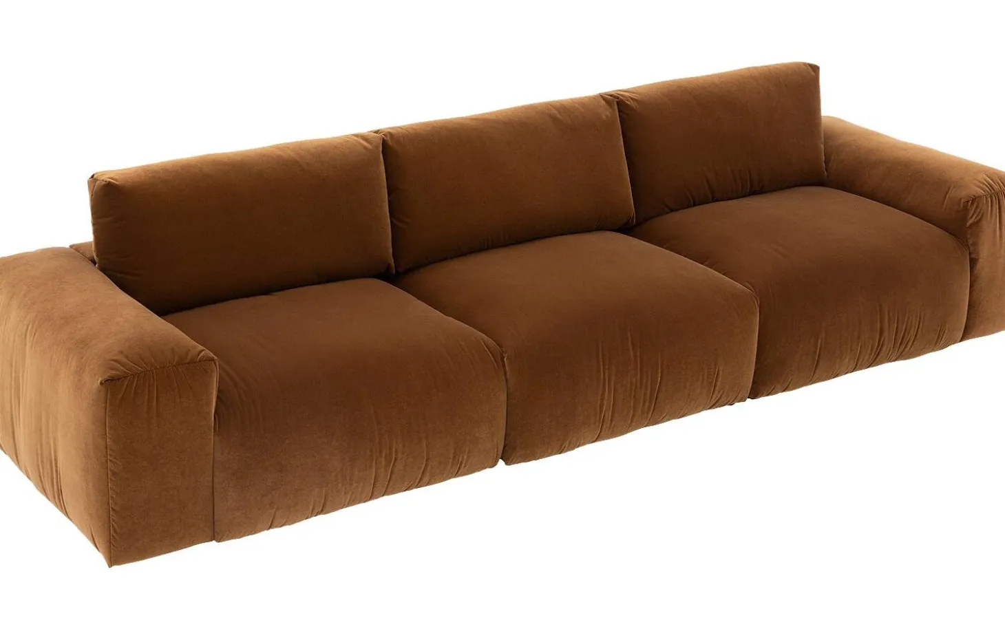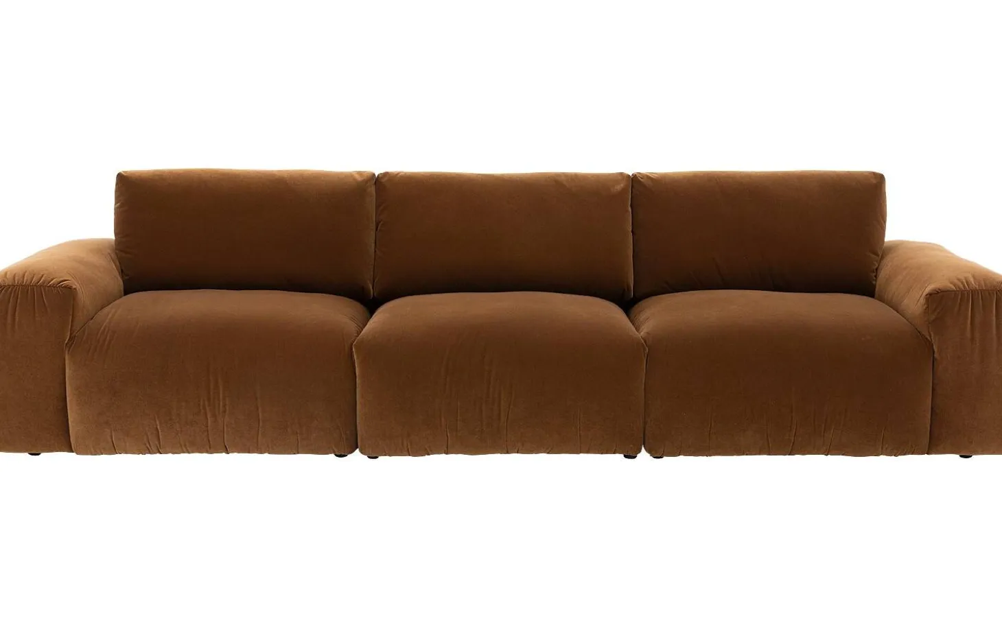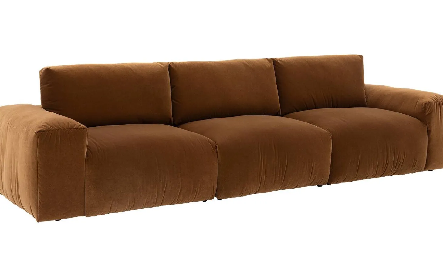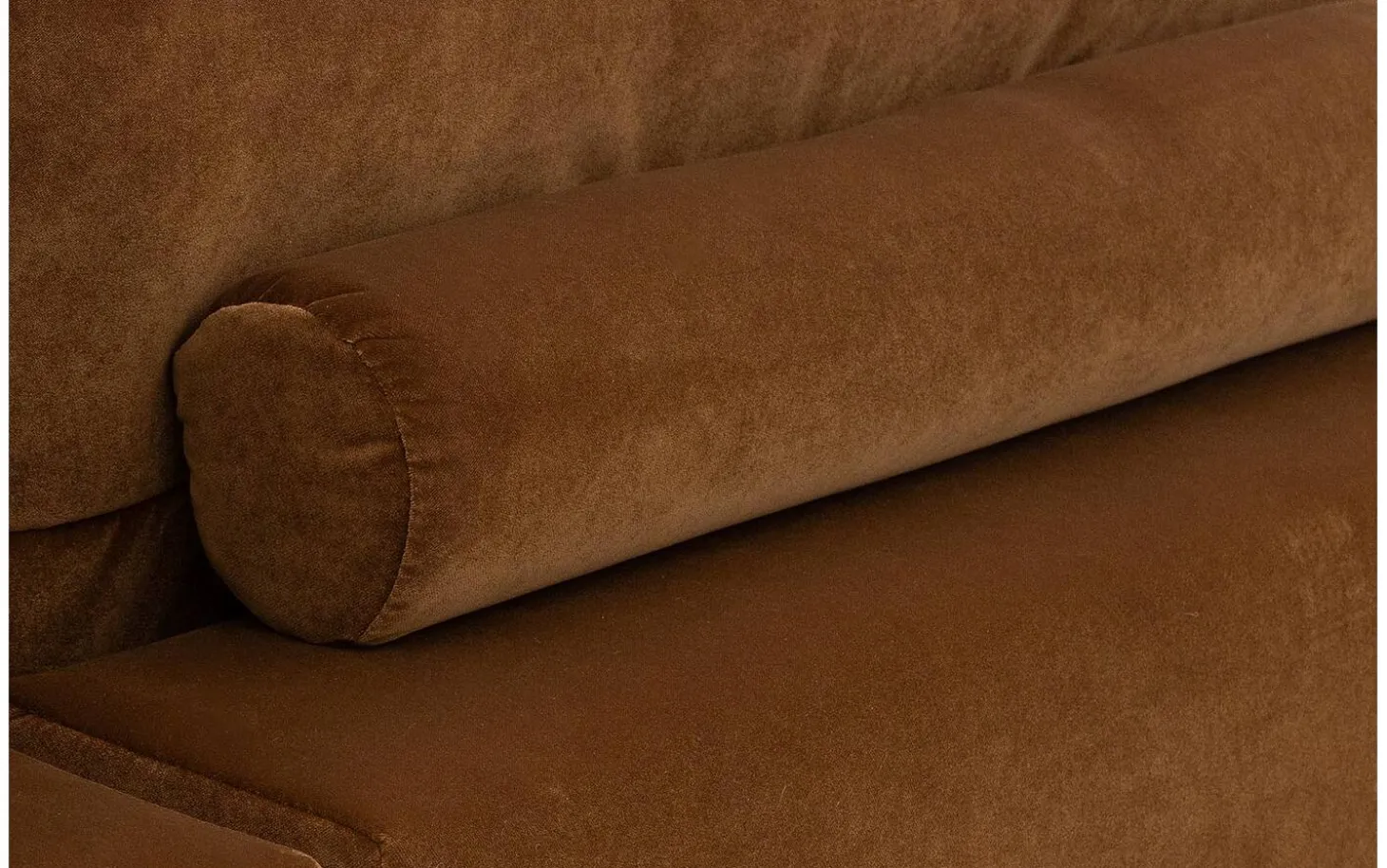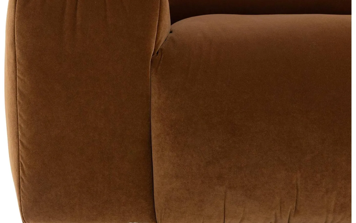 Het zachte veloursmateriaal in de warme bruine kleur ‚wood‘ geeft hoekbank Amara een knusse en uitnodigende uitstraling. De velours heeft een subtiele glans die het licht mooi weerkaatst en voelt heerlijk zacht aan.