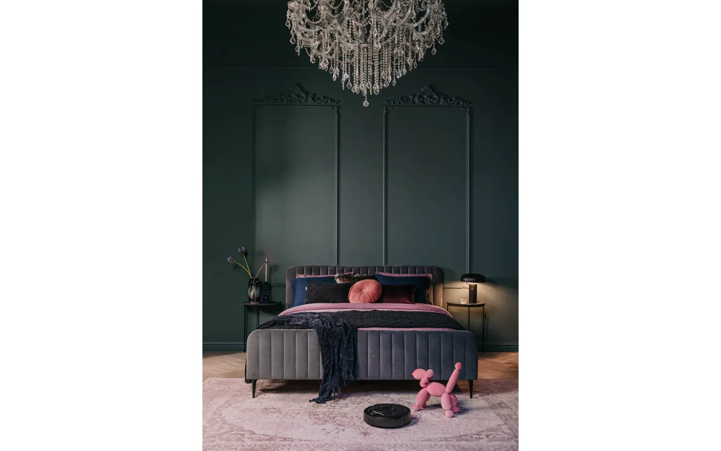 Das Bettgestell ist handwerklich gefertigt. Diese fachkundige Arbeit zeigt sich deutlich in der weichen Polsterung des Kopf- und Fußteils sowie in den handgefertigten Ziernähten. Der Bezug aus Velours verleiht dem Bettgestell zudem eine edle Optik.