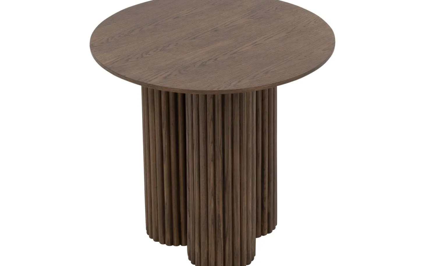Beistelltisch Melani bringt sofort Eleganz in Ihren Raum. Dieser runde Eichenholztisch mit einzigartigem Säulenfuß aus drei zusammengefügten Lattenstrukturen ist ein echter Blickfang. Die warme Smoke-Farbe und das Eichenfurnier sorgen für eine raffinierte, moderne Ausstrahlung, die perfekt in jedes Interieur passt. Ideal als Beistelltisch neben Ihrem Sofa oder Sessel.