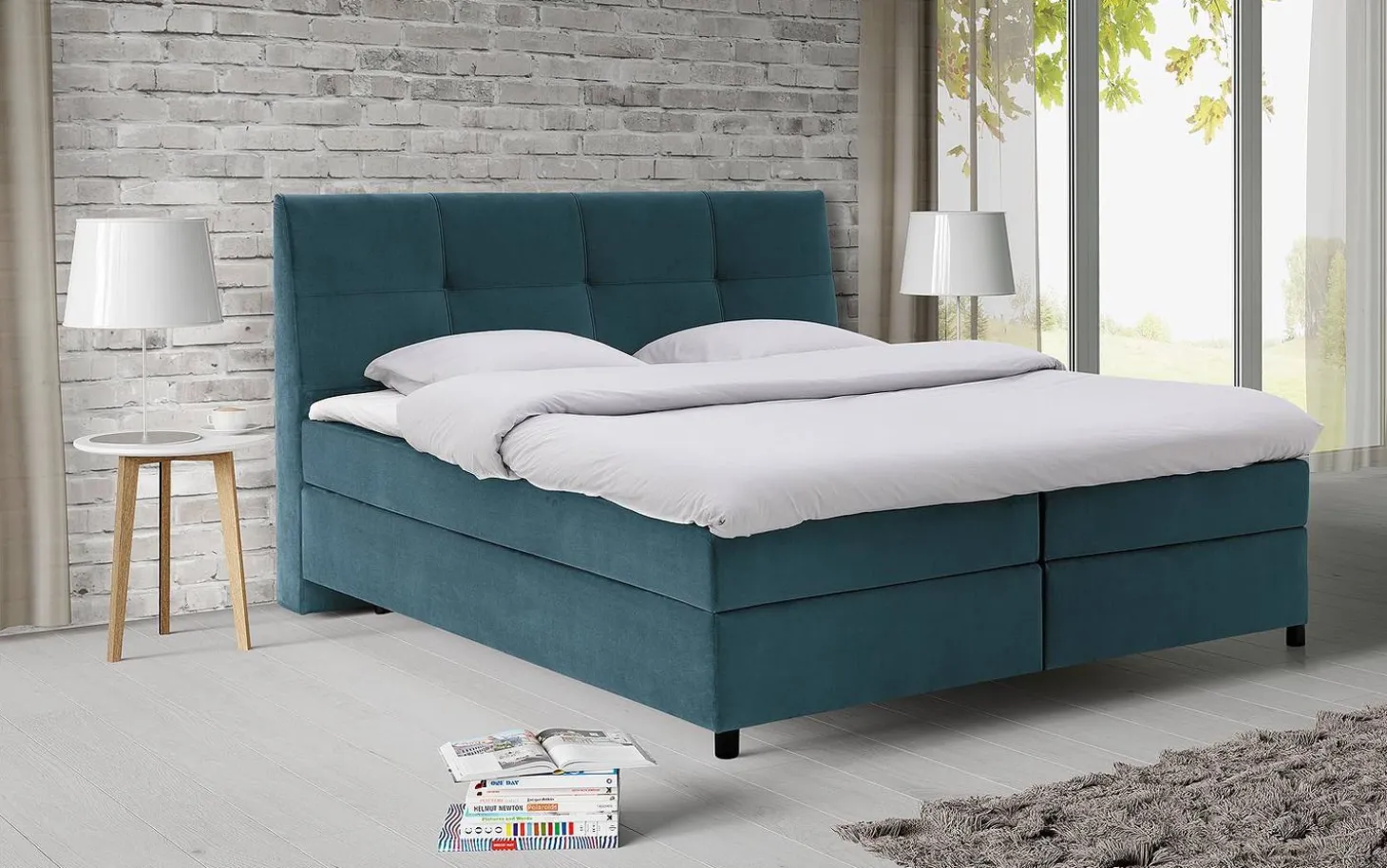 Das Boxspringbett Gusta ist ein anspruchsvolles Modell mit schickem Design und einem ansprechenden Bezug aus blaugrauem Samt. Die eleganten Nähte auf dem Kopfteil sorgen für eine stilvolle Note. Voll im Trend! Die schwarzen Füße sind 12 cm hoch, wodurch das Staubsaugen unter dem Bett zum Kinderspiel wird. In den Kern des Bettkastens ist eine solide Bonellfederung verarbeitet, die eine gute und stabile Basis für die Matratze bieten. Der Bettkasten ist ebenso wie der Kopfteil geradlinig verarbeitet und für ein ansprechendes Gesamtbild mit einem Bezug aus demselben fein gewebten Stoff versehen.
