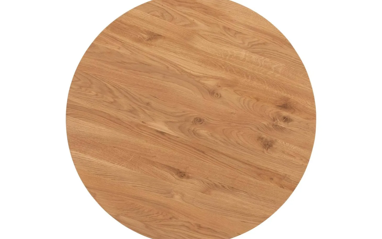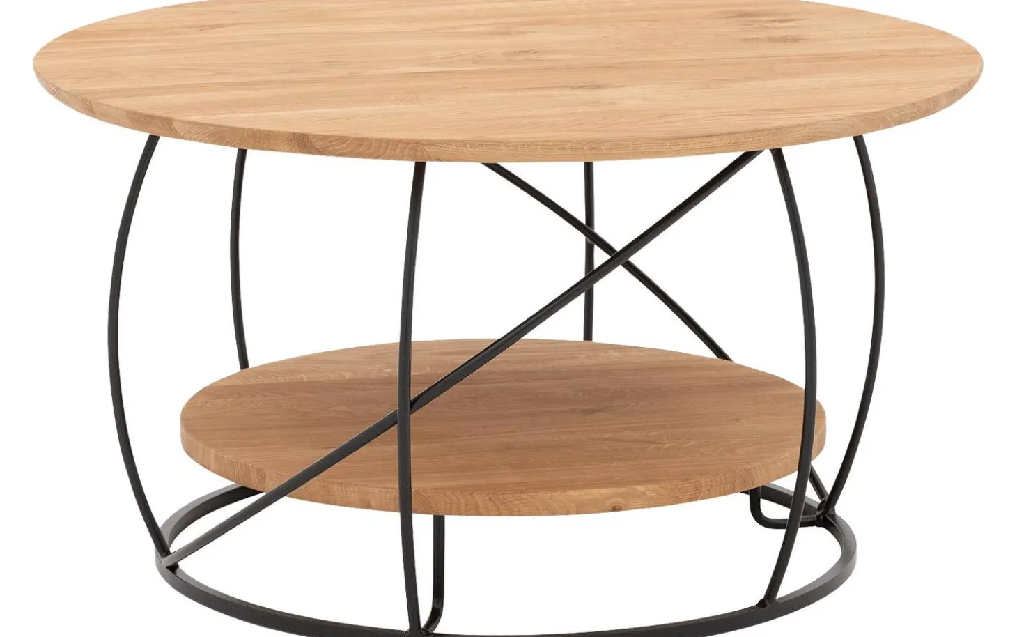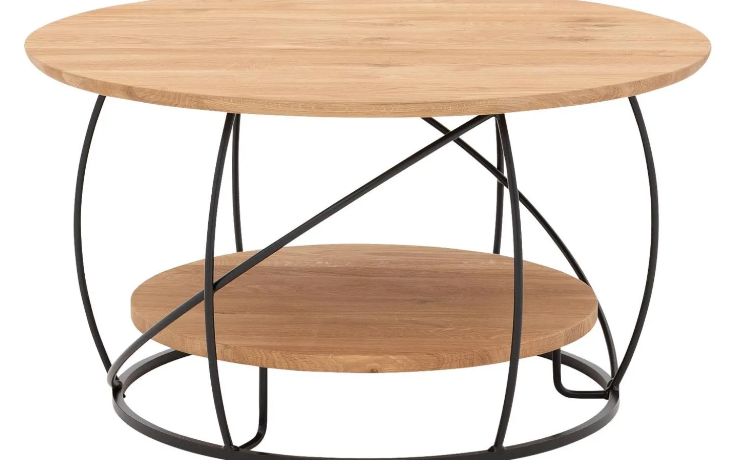 Der Couchtisch Bellis hat eine runde Form mit weichen, organischen Linien, die für eine verspielte und warme Ausstrahlung sorgen. Das Gestell mit runden schwarzen Metallbeinen verleiht dem Tisch einen zeitgemäßen Charakter, während die Eichenholzplatte für natürliche Wärme sorgt.