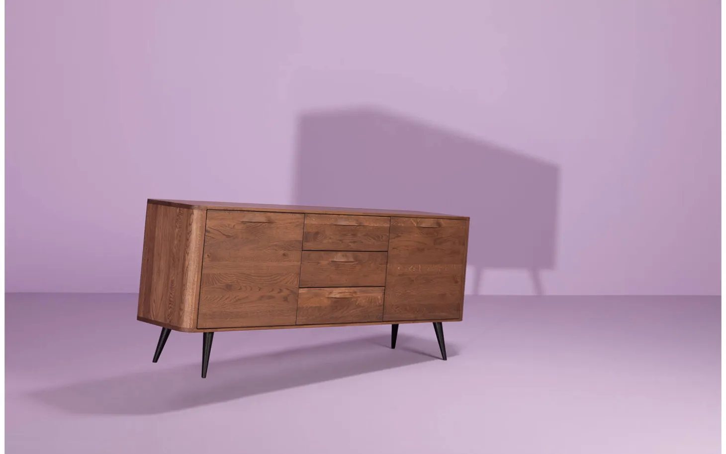 Sideboard Bjarte kombiniert Retro-Charme mit praktischem Stauraum für Ihr Wohnzimmer. Die runden, weit ausladenden Beine verleihen diesem Eichen-Sideboard eine trendige Vintage-Ausstrahlung, während die 2 Türen und 3 Schubladen mit Soft-Close-System für stilvolle Aufbewahrung sorgen. Perfekt, um Ihre liebsten Wohnaccessoires zur Geltung zu bringen und gleichzeitig alles ordentlich zu verstauen.