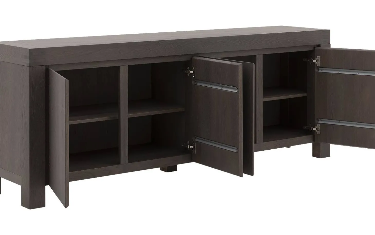 De vier deuren van dit eiken dressoir zijn uitgevoerd met een moderne push-to-open functie. Geen handgrepen, alleen strakke lijnen en een opgeruimde uitstraling. De soft touch lak beschermt het hout tegen kringen en krasjes, terwijl de natuurlijke nerf zichtbaar en voelbaar blijft.