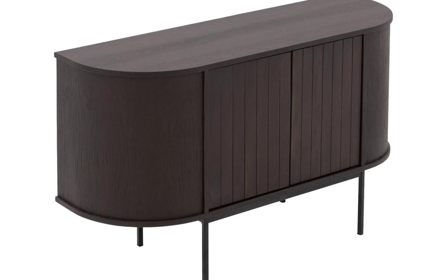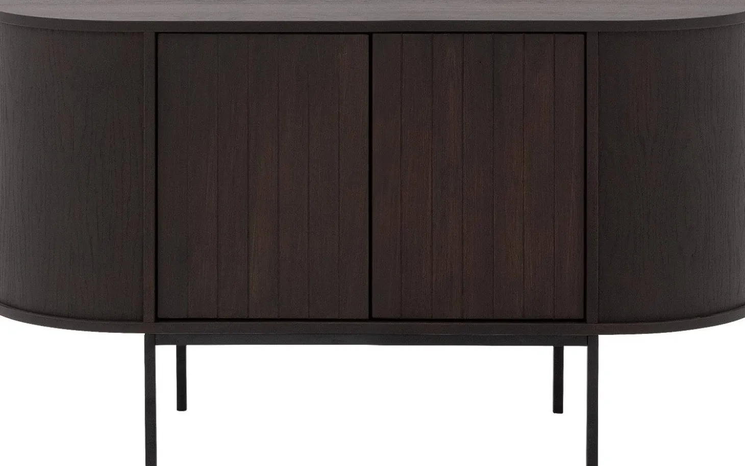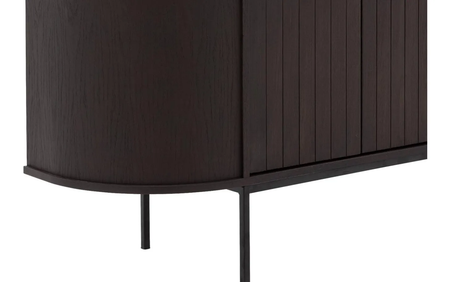 Sideboard Delfina kombiniert elegante Rundungen mit robusten industriellen Akzenten. Die vertikal gestreiften Türen und subtilen schwarzen Metallfüße verleihen diesem braunen Eichen-Sideboard eine einzigartige Ausstrahlung, die auffällt, aber zeitlos bleibt. Perfekt für alle, die stilvolles Aufräumen mit einem modernen Touch lieben.