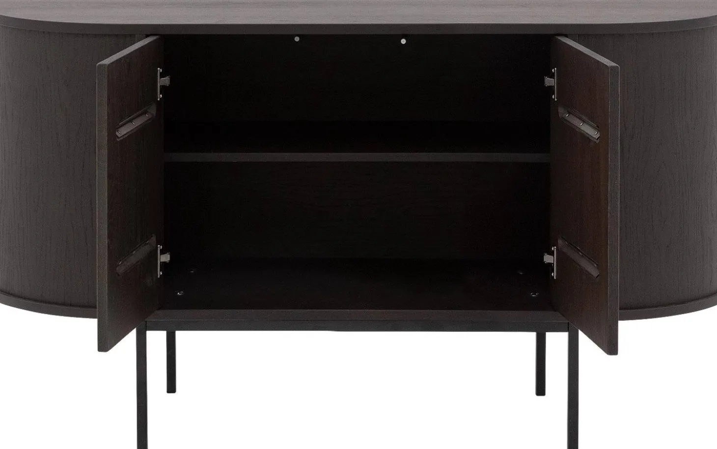 Dieses braune Eichen-Sideboard strahlt Wärme und Charakter durch die reiche Espresso-Farbe aus. Die sanft abgerundeten Ecken sorgen für eine freundliche Ausstrahlung, während die schwarzen Metallfüße einen robusten Akzent setzen. Eine perfekte Balance zwischen modernem Design und natürlicher Wärme.