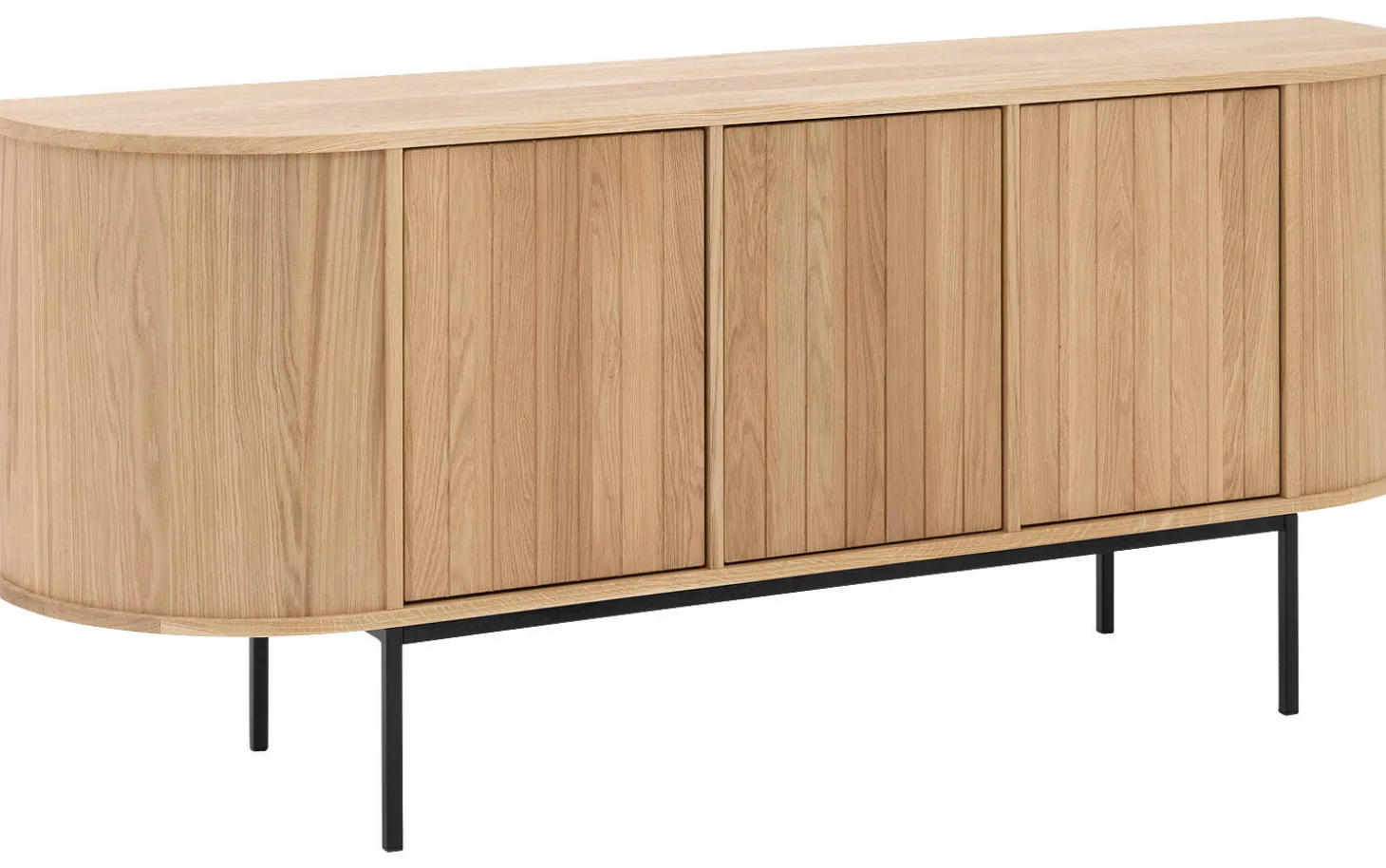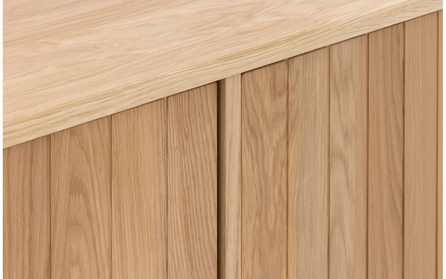 Dieses Eichen-Sideboard strahlt moderne Wärme aus durch die Kombination von massivem Eichenholz und Eichen-Furnier in einem natürlichen Soft-Touch-Lack. Die abgerundeten Ecken und vertikal gestreiften Türen verleihen Delfina eine einzigartige, verspielte Ausstrahlung, die auffällt aber dennoch zeitlos bleibt. Perfekt für jeden modernen Wohnraum.