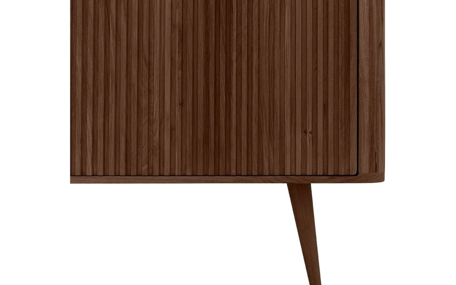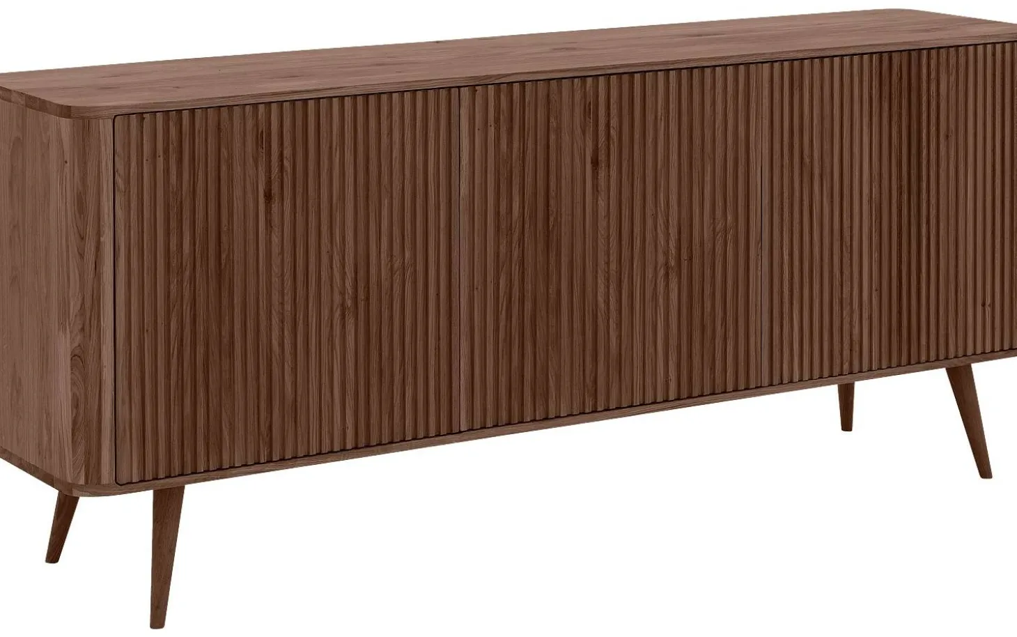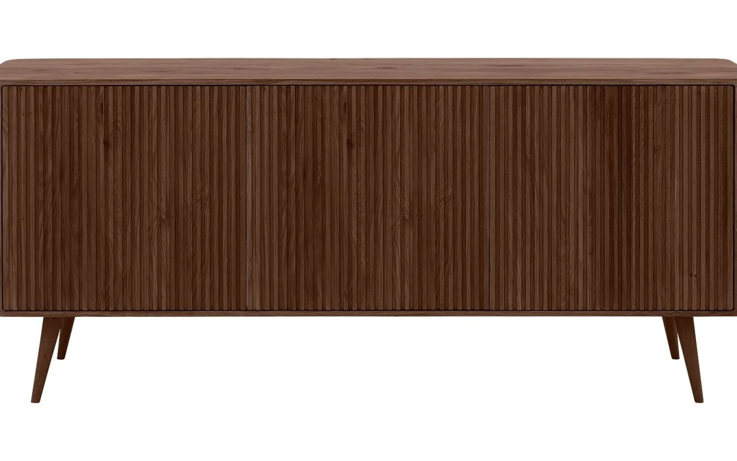 Dieses dunkle Eichen-Sideboard bringt skandinavische Ruhe in Ihr Interieur. Sideboard Seppe kombiniert Retro-Design mit praktischem Stauraum hinter drei Türen. Das praktische Push-to-Open-System sorgt für klare Linien ohne Griffe, während der warme Nussbaumton eine natürliche Ausstrahlung verleiht.