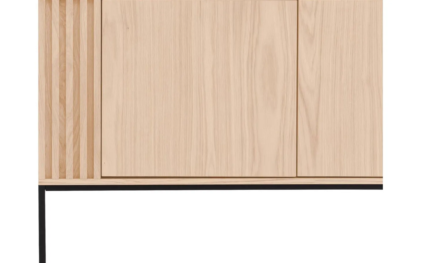 Sideboard Viola strahlt moderne Eleganz mit seinen klaren Linien und der raffinierten White Oak-Oberfläche aus. Die schwarzen Metallbeine sorgen für einen schönen Kontrast und verleihen dem Sideboard eine luftige Ausstrahlung. Perfekt kombinierbar mit verschiedenen Einrichtungsstilen, von skandinavisch bis industriell.