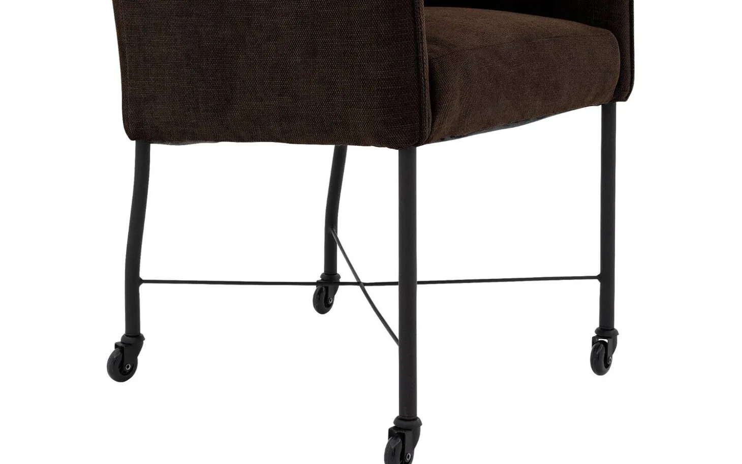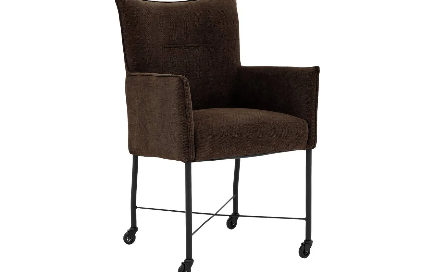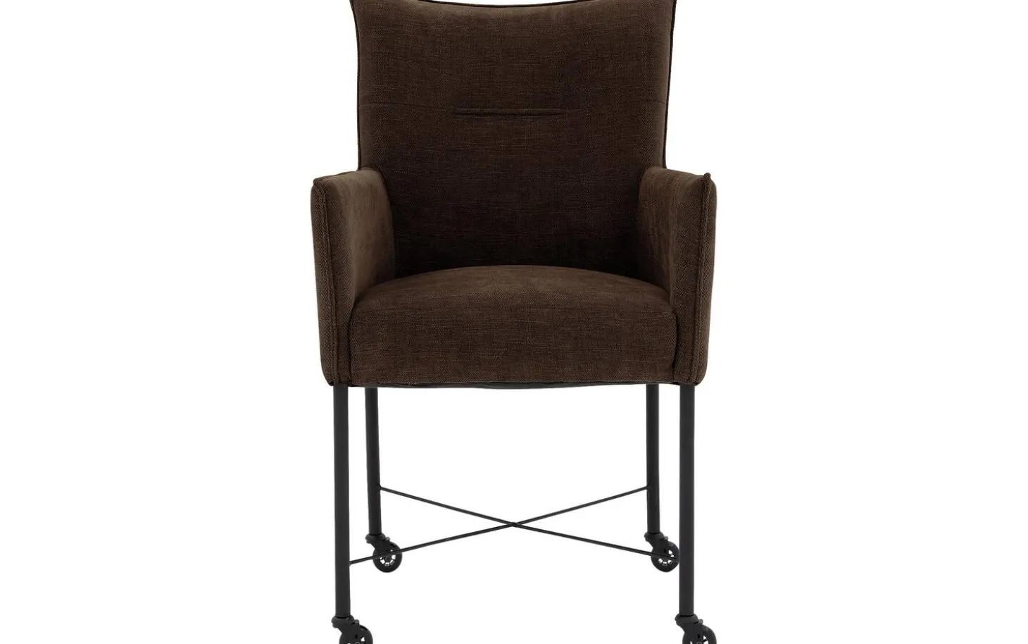 Der braune Esszimmerstuhl Erik mit Armlehne bietet Komfort und Stil in einem. Dieser fein gewebte Stuhl aus Stoff passt dank seiner vielseitigen Ausstrahlung perfekt zu jedem Esstisch. Die praktischen schwarzen Rollen sorgen dafür, dass Sie leicht an den Tisch heranrücken oder aufstehen können, ideal während eines gemütlichen Essens oder einer Geburtstagsfeier. Das moderne Design des Esszimmerstuhls Erik macht ihn zu einem echten Blickfang in Ihrem Esszimmer.