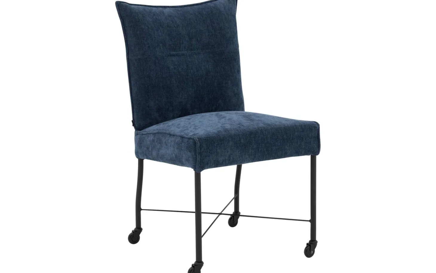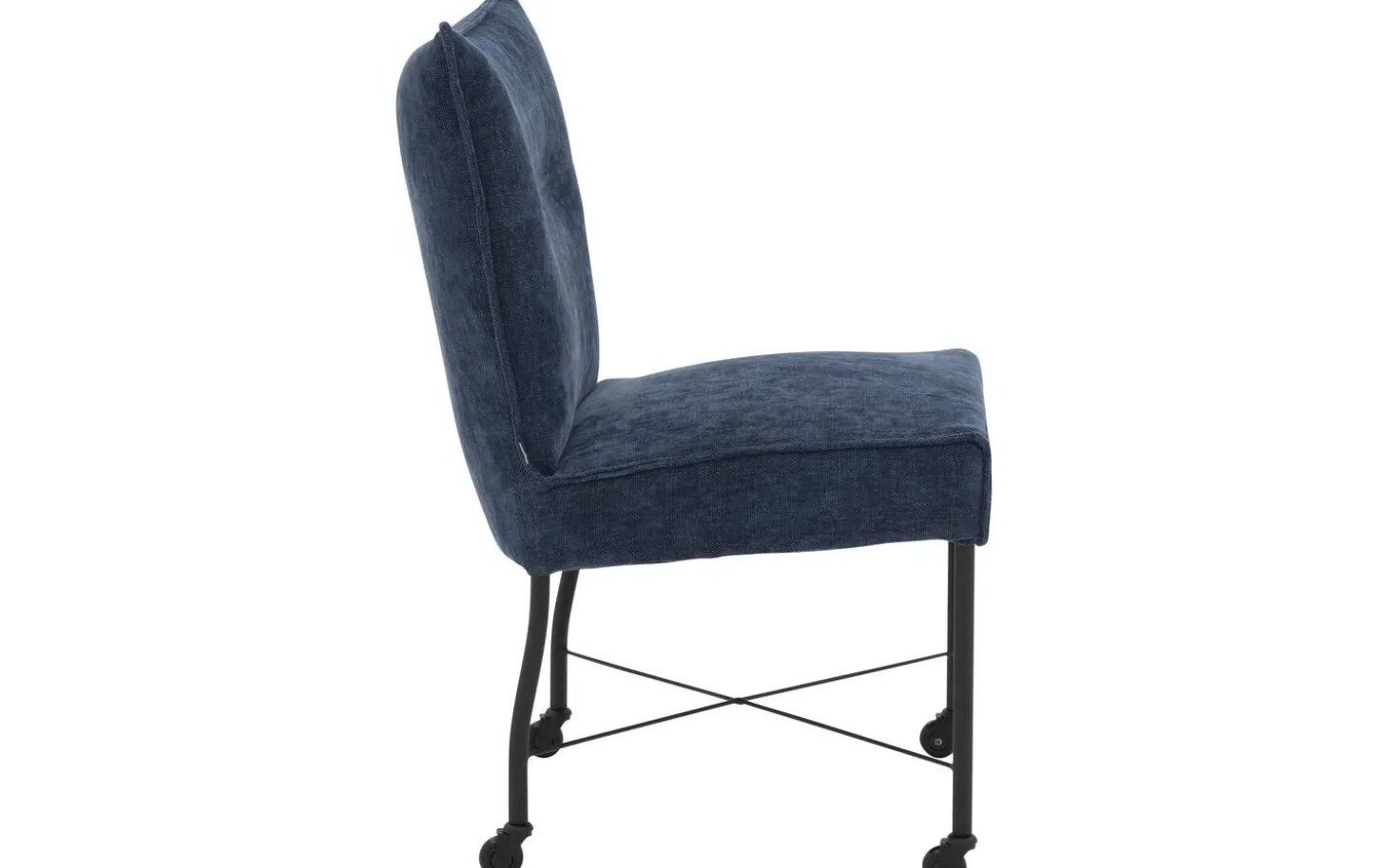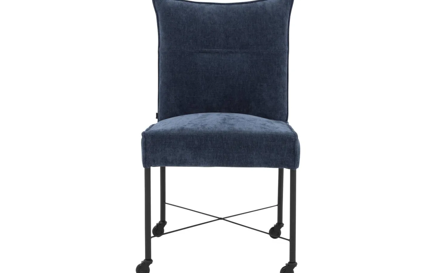 Endlos tafeln mit dem blauen Esszimmerstuhl Erik ohne Armlehne. Dieser stilvolle Stuhl aus fein gewebtem dunkelblauem Stoff bringt moderne Eleganz in Ihr Esszimmer. Die praktischen Skaterrollen machen es leicht, an den Tisch zu rollen und wieder aufzustehen – ideal während eines Dinners oder einer Party. Mit seinem modernen Design ist der Stuhl Erik eine vielseitige Wahl für Ihren Esstisch, an dem Sie stundenlang zusammensitzen können.