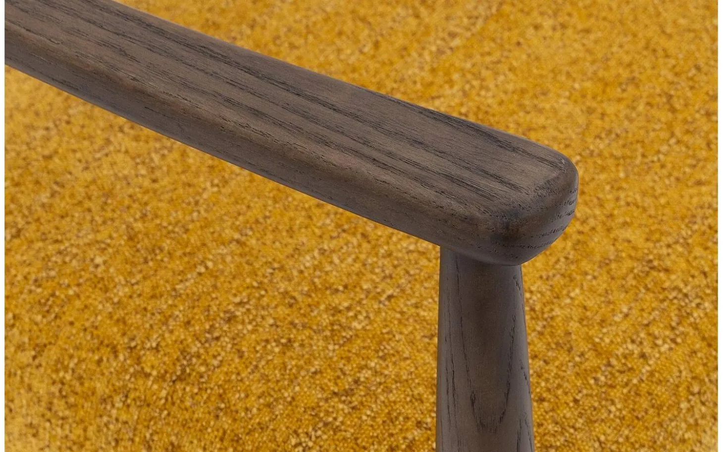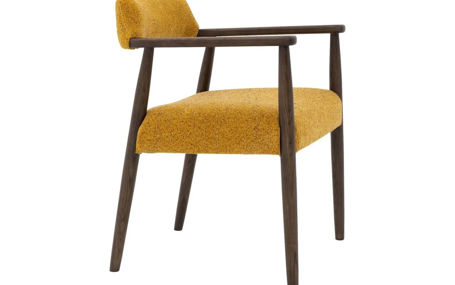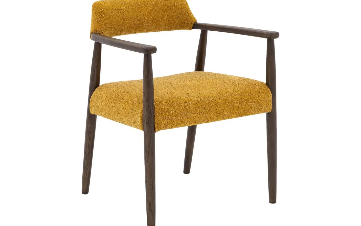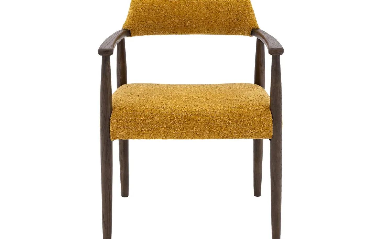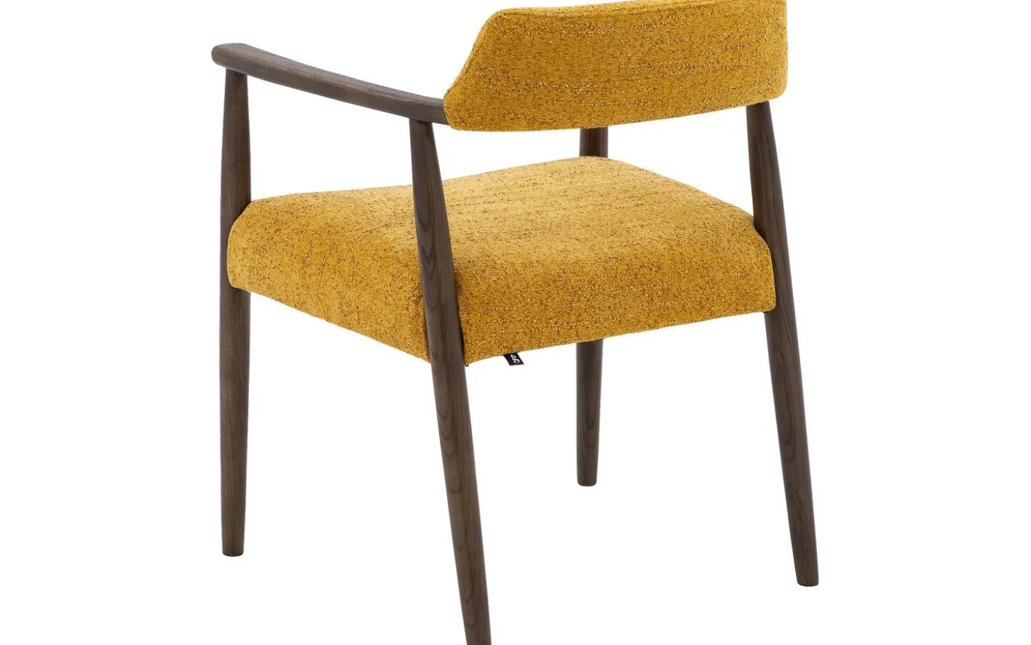 Die dunkel cognacfarbenen lackierten Eschenbeine bieten eine stabile Basis und bilden einen schönen Kontrast zum gelben Stoff. Mit einer Sitzhöhe von 46 cm passt dieser Stuhl perfekt zu den meisten Esstischen. Die Armlehnen machen das Sitzen besonders komfortabel, vor allem bei längeren Mahlzeiten.