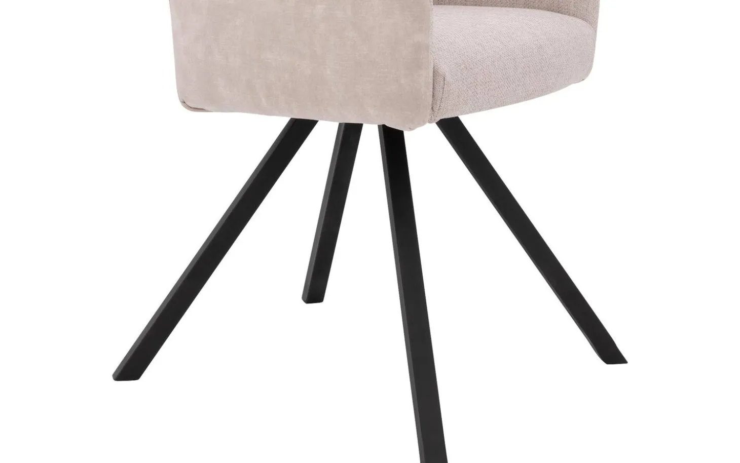 Der melierte grob gewebte Stoff im Naturton verleiht dem Esszimmerstuhl Jesse eine warme und rustikale Ausstrahlung. Diese Polsterung wird durch den Velourstoff an der Rückenlehne schön akzentuiert, was nicht nur ein angenehmes Gefühl bietet, sondern auch einen stilvollen visuellen Kontrast erzeugt.