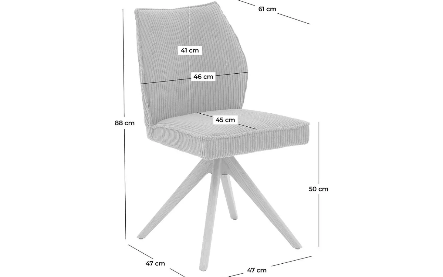 Das naturbelassene, lackierte Eichenholzgestell bildet eine schöne Kombination mit dem warmen Cordstoff. Durch die Drehfunktion haben Sie alle Bewegungsfreiheit, während die Returnfunktion dafür sorgt, dass der Stuhl ordentlich in die ursprüngliche Position zurückkehrt, wenn Sie aufstehen. So bleibt Ihr Esszimmer immer aufgeräumt.
