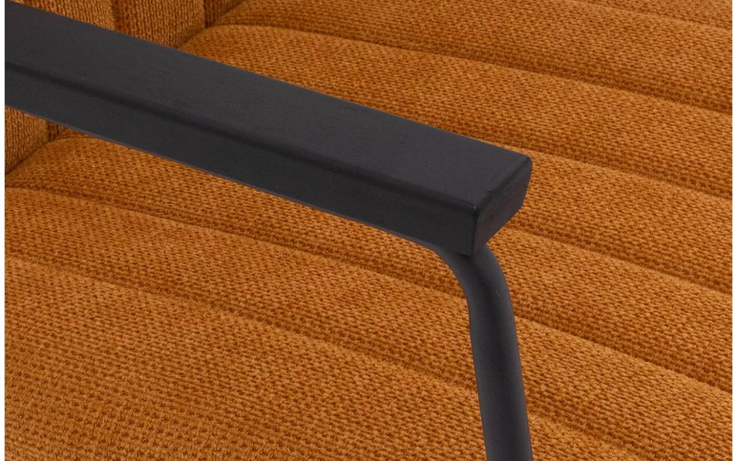 Gezellig tafelen met gele eetkamerstoel Manta met armleuning. Deze stoel valt op door de fijne lijnen en de grofgeweven kerriegele stoffering met verticale stiksels. De zwart metalen poot loopt naadloos over in een armleuning met fraaie armlegger, wat zorgt voor een eigentijdse en stijlvolle uitstraling. Perfect voor wie een urban industrieel interieur heeft of op zoek is naar een stoer accent aan de eettafel.