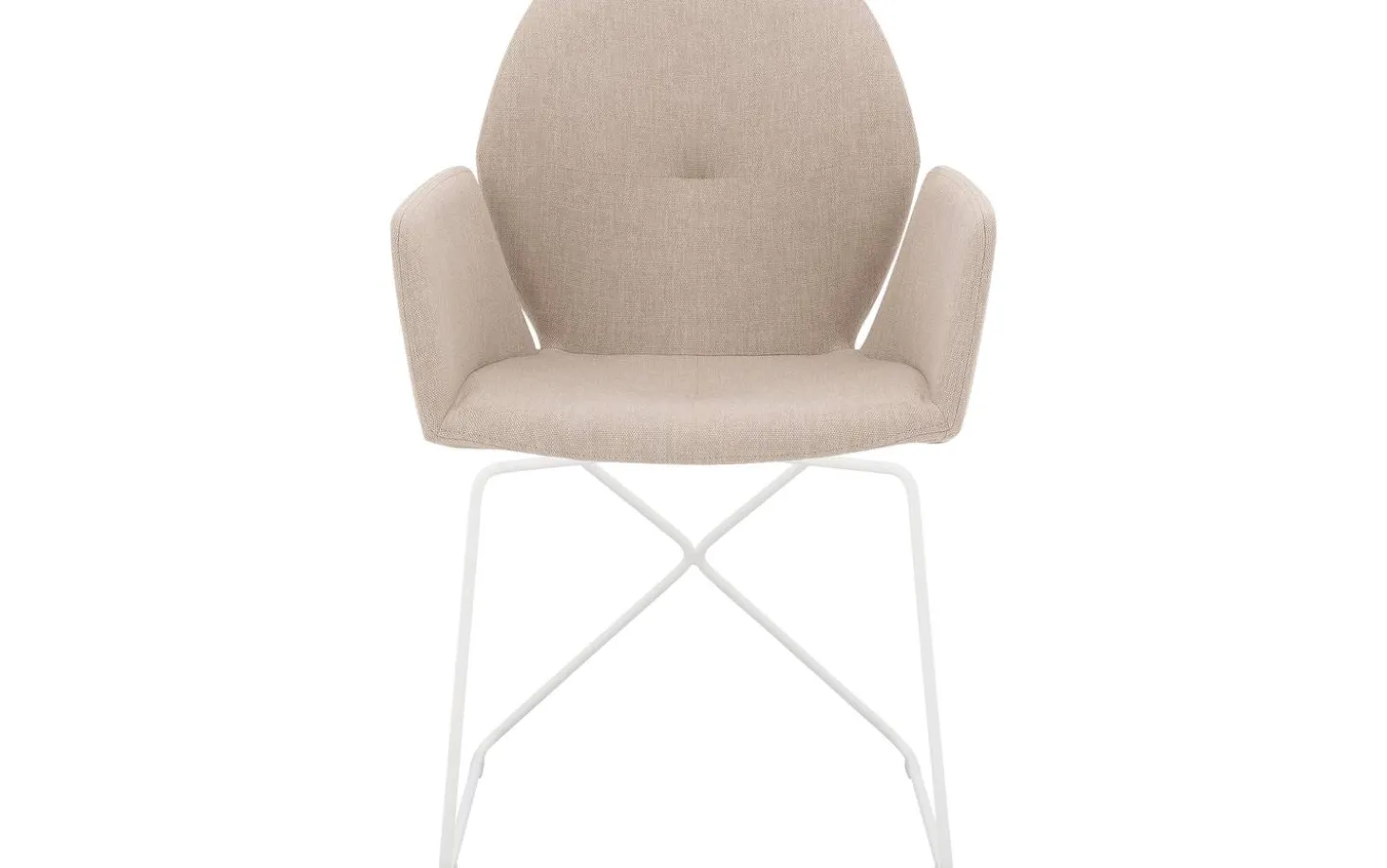 Der beige, fein gewebte Stoffbezug kombiniert wunderbar mit dem weißen Gestell und bietet eine neutrale, aber stilvolle Ausstrahlung. Dank der festen Polsterung behält der Stuhl seine klare, moderne Form und bleibt jahrelang schön. Die räumliche Konstruktion macht ihn zu einem echten Blickfang an Ihrem Esstisch.