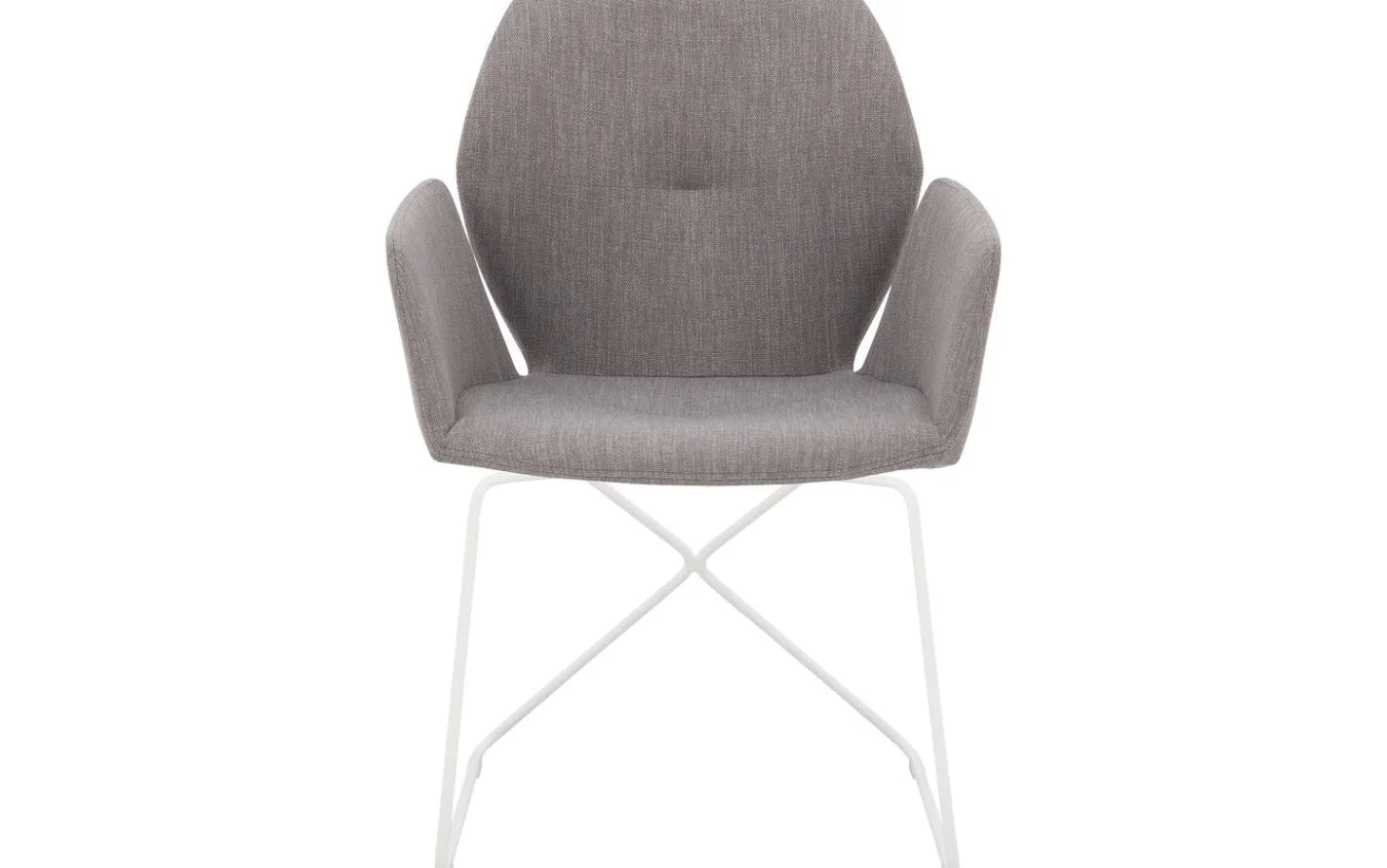 Grauer Esszimmerstuhl mit Armlehne Manzini ist ein modernes Designstück, das sowohl in großen als auch in kleinen Esszimmern geräumig wirkt. Dieser Esszimmerstuhl fällt durch die stilvolle Ziersteppung auf der Rückenlehne und das schlanke, weiß pulverbeschichtete Gestell auf. Die fein gewebte silberfarbene Polsterung macht diesen Stuhl zu einem subtilen Blickfang an Ihrem Esstisch, während die dezente Ausstrahlung dafür sorgt, dass er zu verschiedenen Einrichtungsstilen passt.