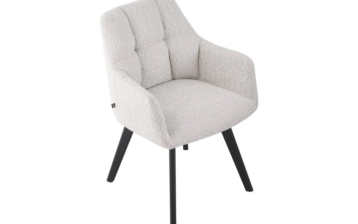Der Bouclé-Stoff im Naturton verleiht dem Esszimmerstuhl Mara eine warme und einladende Ausstrahlung. Die luxuriöse Struktur des Stoffes fügt nicht nur Textur zu Ihrem Interieur hinzu, sondern ist auch angenehm zu besitzen. Das schwarze Gestell mit Pulverbeschichtung bildet einen schönen Kontrast zur warmen Farbe und sorgt für einen stilvollen, modernen Touch.