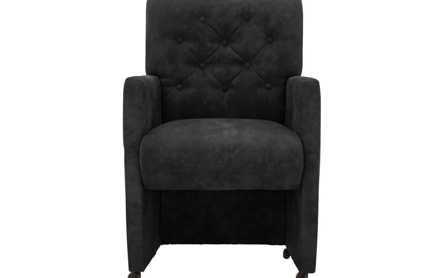 Machen Sie Ihr Esszimmer komplett mit dem grauen Esszimmerstuhl Oliver mit Armlehne. Dieser moderne Esszimmersessel ist mit weichem Mikrofaser in Anthrazit bezogen, was für eine warme Ausstrahlung in Ihrem Interieur sorgt. Durch den gesteppten Rücken erhält Oliver einen besonders charaktervollen Charme. Der Stuhl ist praktisch mit luxuriösen Rollen ausgestattet, sodass Sie beim Essen bequem an den Tisch rollen und aufstehen können. Am oberen Teil der Rückenlehne befindet sich ein praktischer silberfarbener Griff, mit dem Sie den Stuhl leicht bewegen können.