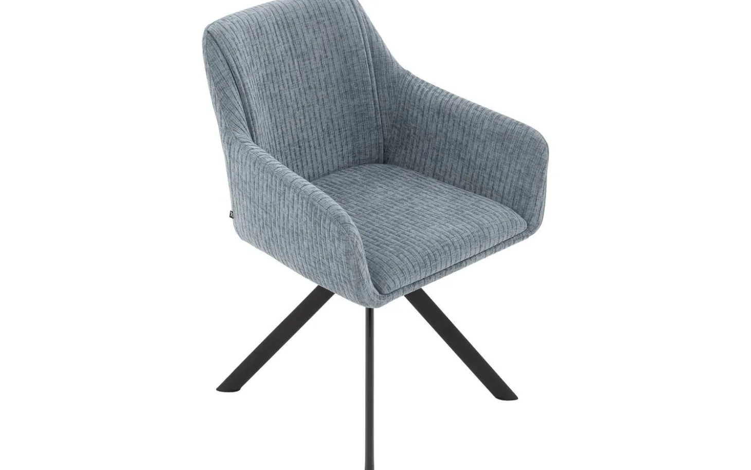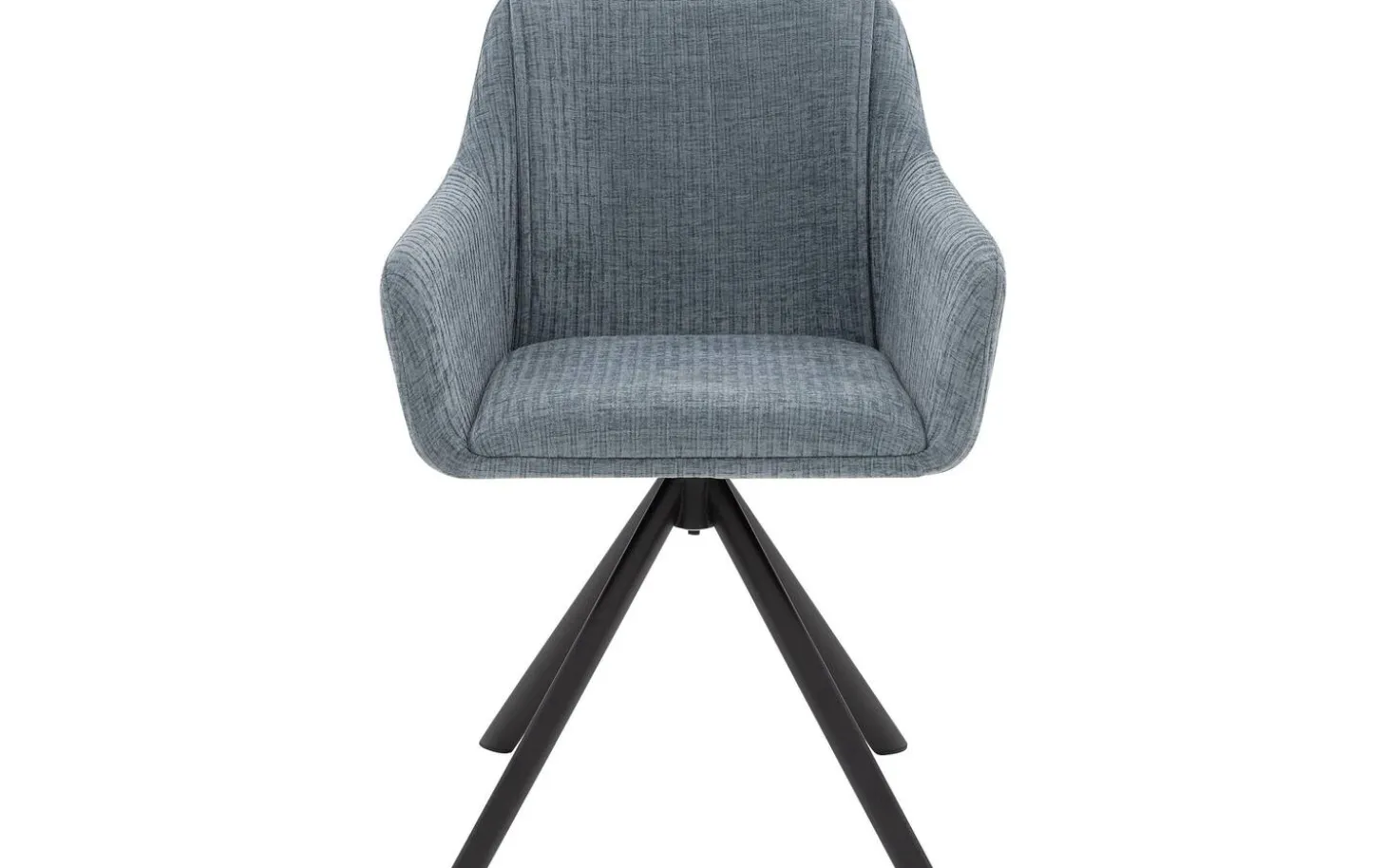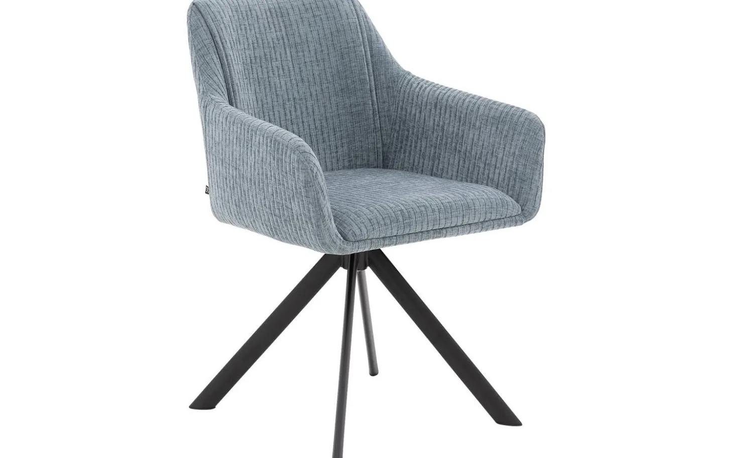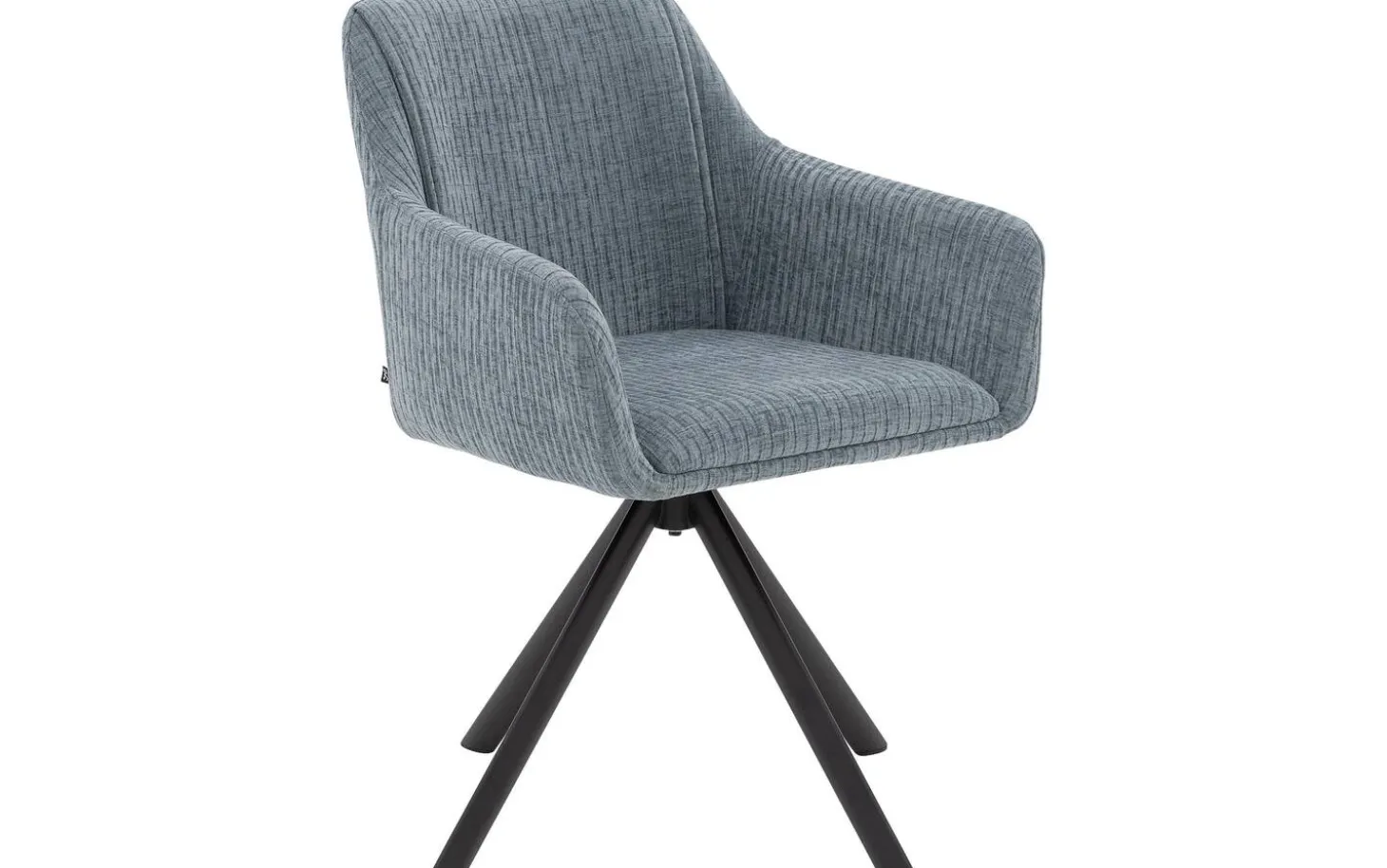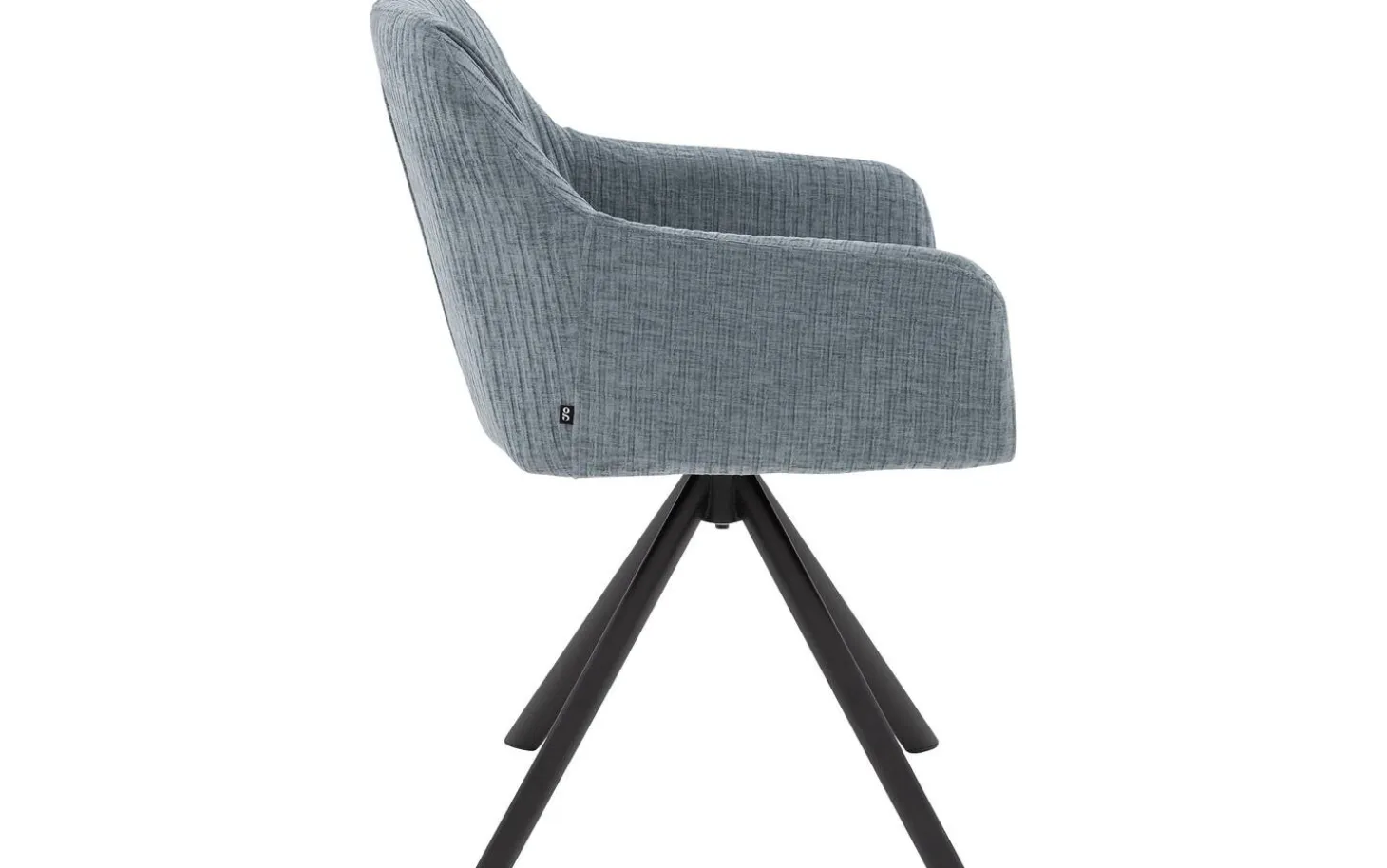 Gezellig tafelen met blauwe eetkamerstoel Ysmay met armleuning. Deze eigentijdse eetstoel combineert modern design met praktisch comfort. De handige 360 graden draaifunctie maakt het makkelijk om aan te schuiven bij de eettafel. De trendy blauwe ribstof geeft je eetkamer een speelse en frisse uitstraling. Dankzij de comfortabele schuimvulling geniet je volop van lange diners met familie en vrienden.