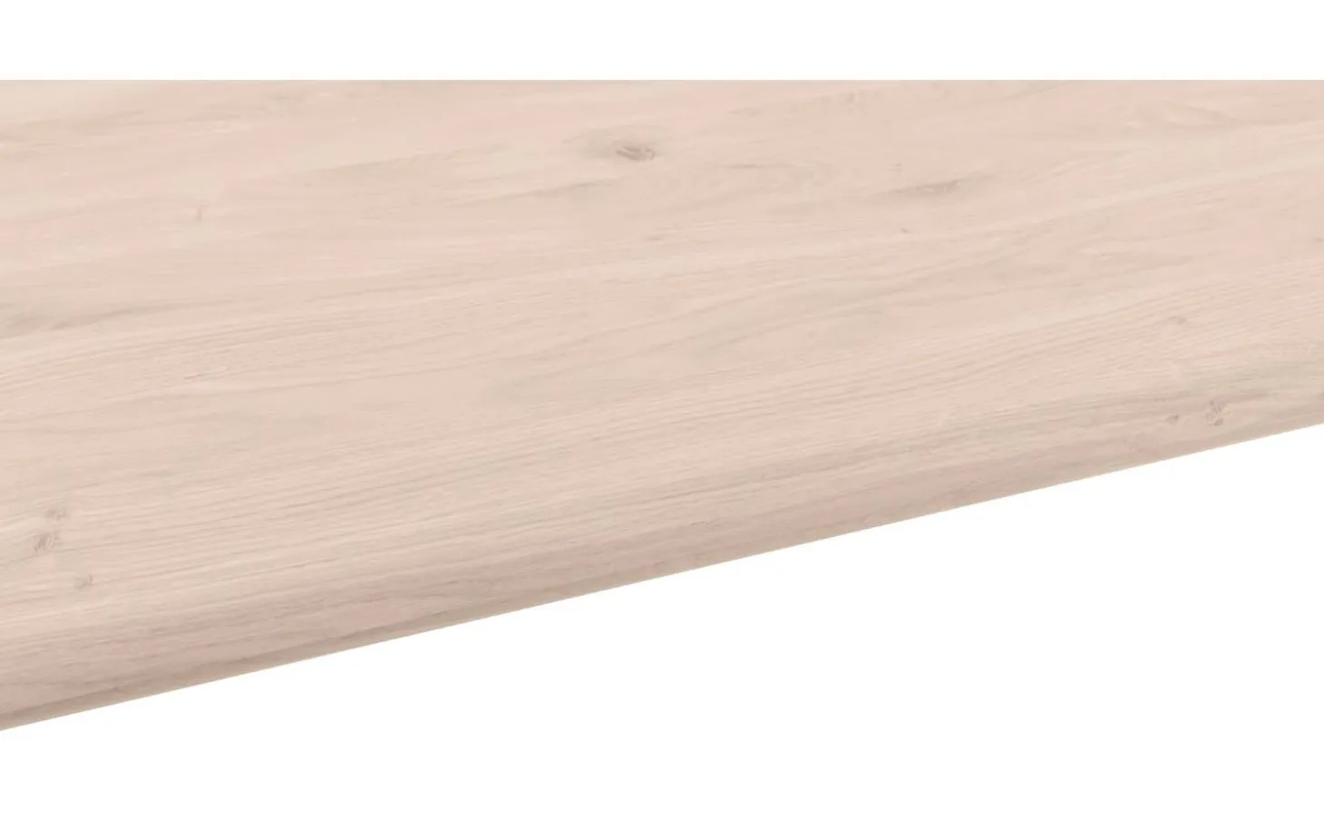 Die cremeweiße Tischplatte ist aus massivem Eichenholz mit einer schützenden Lackschicht gefertigt. Diese Verarbeitung sorgt dafür, dass das Holz weniger schnell Flüssigkeiten aufnimmt und verringert die Gefahr von Flecken und Ringen. Die natürlichen Maserungen verleihen jedem Exemplar einen einzigartigen Charakter.