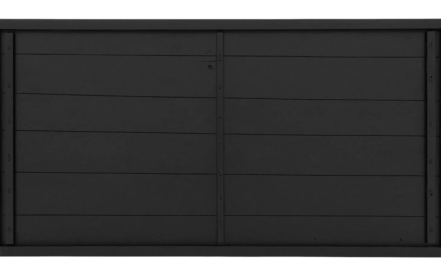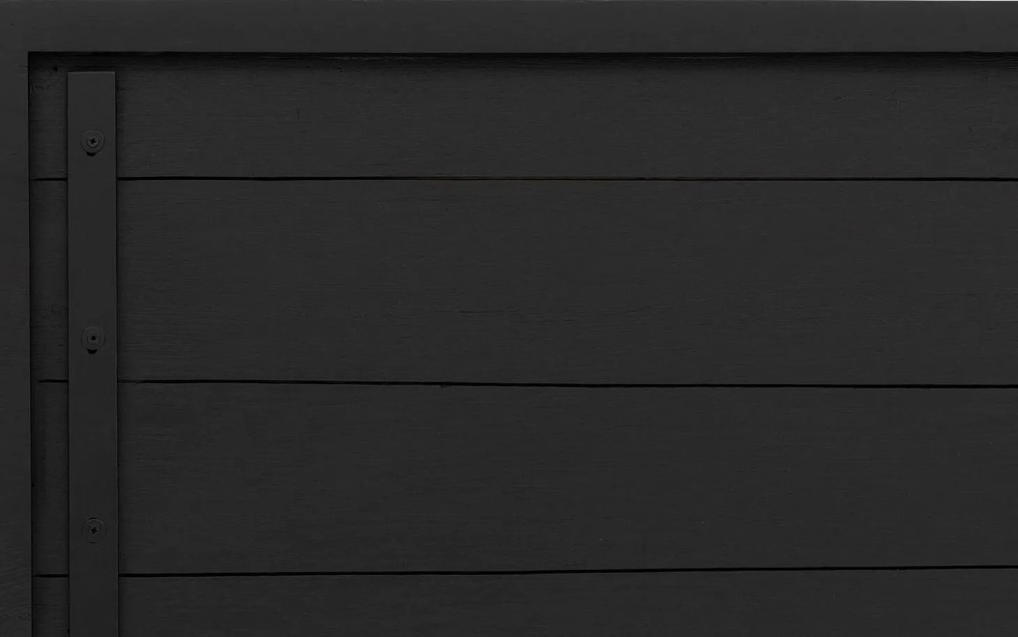 Die Eichenholz-Tischplatte hat eine schwarze Soft-Touch-Lack-Veredelung, die die natürliche Maserung sichtbar hält. Der gerade Tischrand verleiht eine klare Ausstrahlung, während die Innenseite aus Resteiche und die massive Eichenholzplatte für extra Haltbarkeit sorgen.