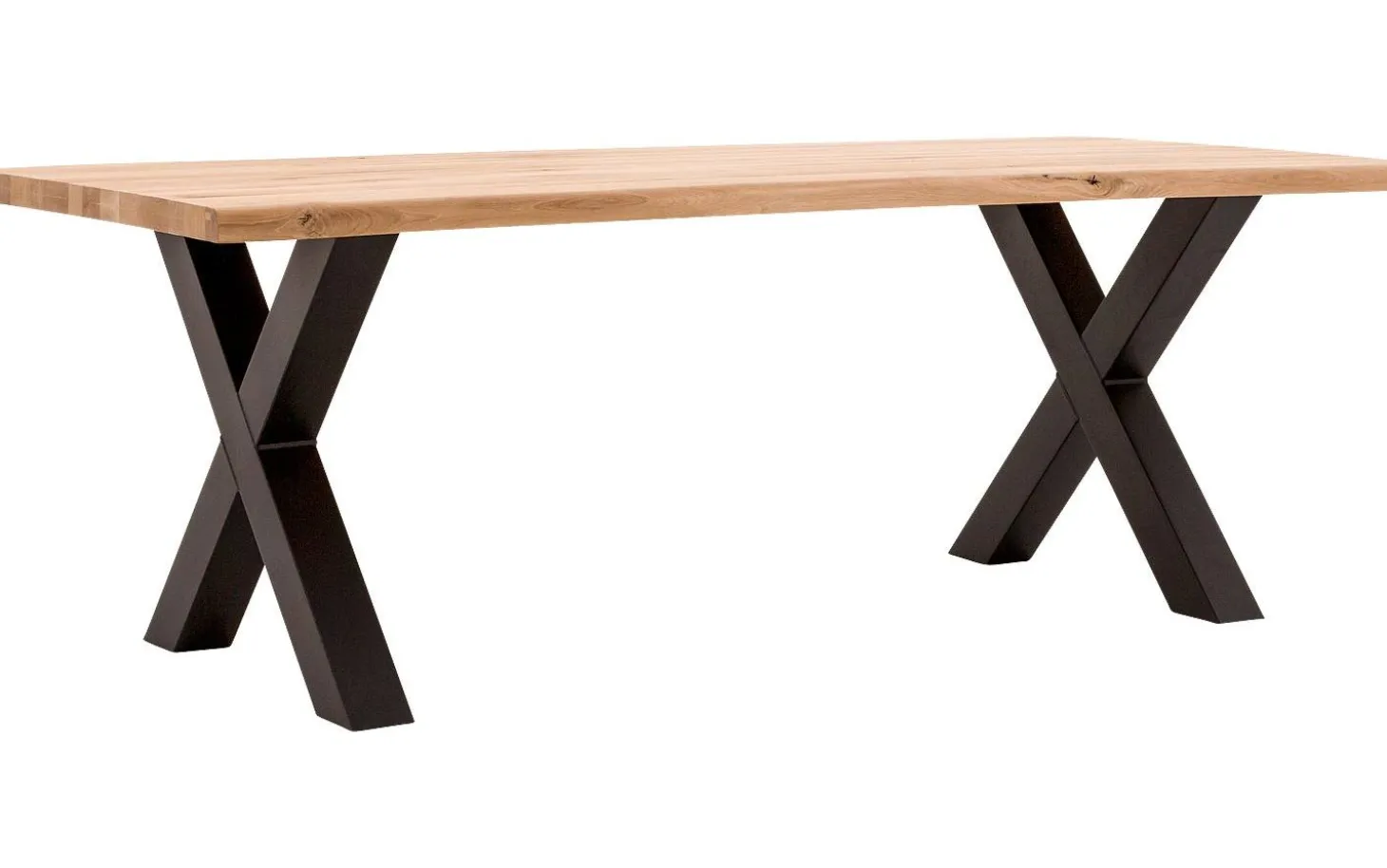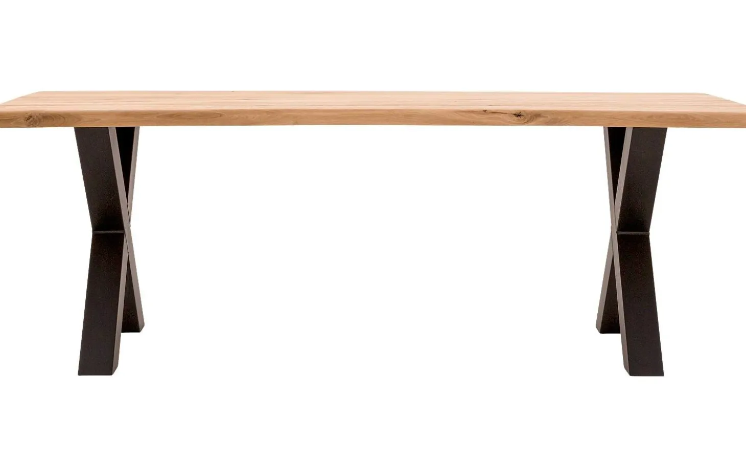 Die industriellen X-Beine aus schwarzem Metall sorgen für Stabilität und eine robuste Ausstrahlung. Durch die clevere Konstruktion haben Sie optimale Beinfreiheit, was den Komfort am Tisch erhöht. Verstärkungsprofile unter dem Blatt halten den Tisch jahrelang in Form.