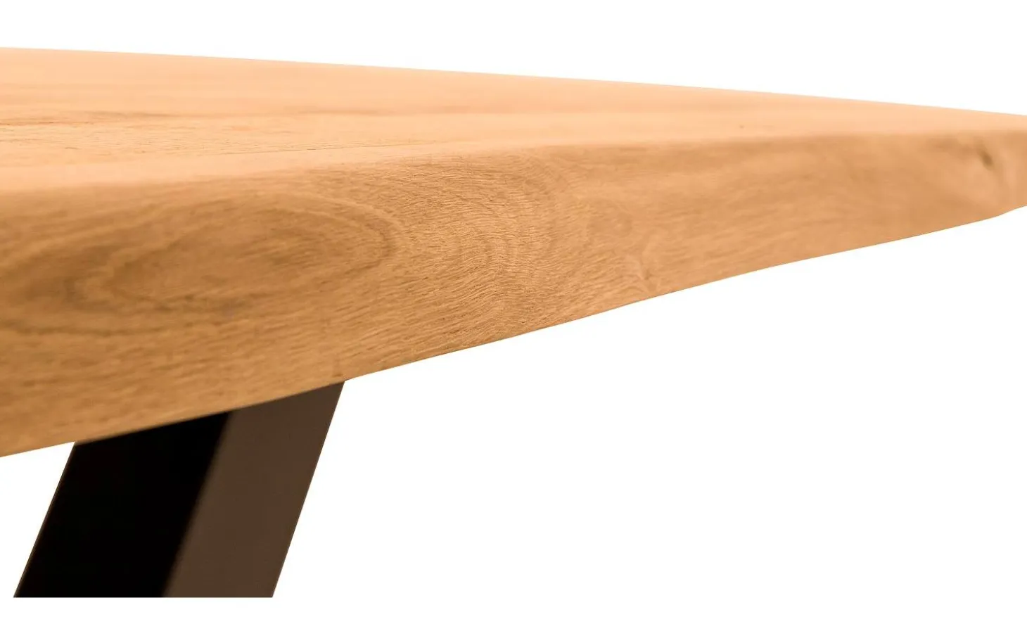 Esstisch Blade hat eine rechteckige Form mit gewölbten Rändern, die den Baumstammcharakter betonen. Die schwarzen X-Beine aus pulverbeschichtetem Metall verleihen dem Tisch eine kraftvolle, industrielle Basis, die schön mit dem warmen Eichenholz kontrastiert.
