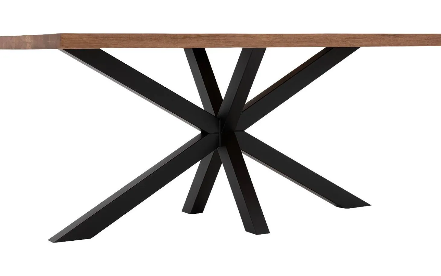 Das Kreuzfuß-Untergestell aus schwarzem Metall hat eine Pulverbeschichtung für zusätzlichen Schutz. Verstärkungsprofile unter der Platte sorgen dafür, dass der Tisch jahrelang seine Form behält. Durch die intelligente Fußplatzierung haben Sie optimale Beinfreiheit.