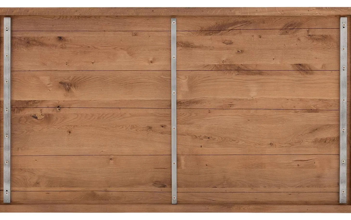Die Tischplatte ist aus massivem Eichenholz mit einem schützenden Soft-Touch-Lack gefertigt. Diese Veredelung bewahrt die natürliche matte Ausstrahlung und sorgt für weniger Ränder und Kratzer. Der gerade Tischrand von 6 cm Dicke verleiht ein geradliniges und robustes Gesamtbild.