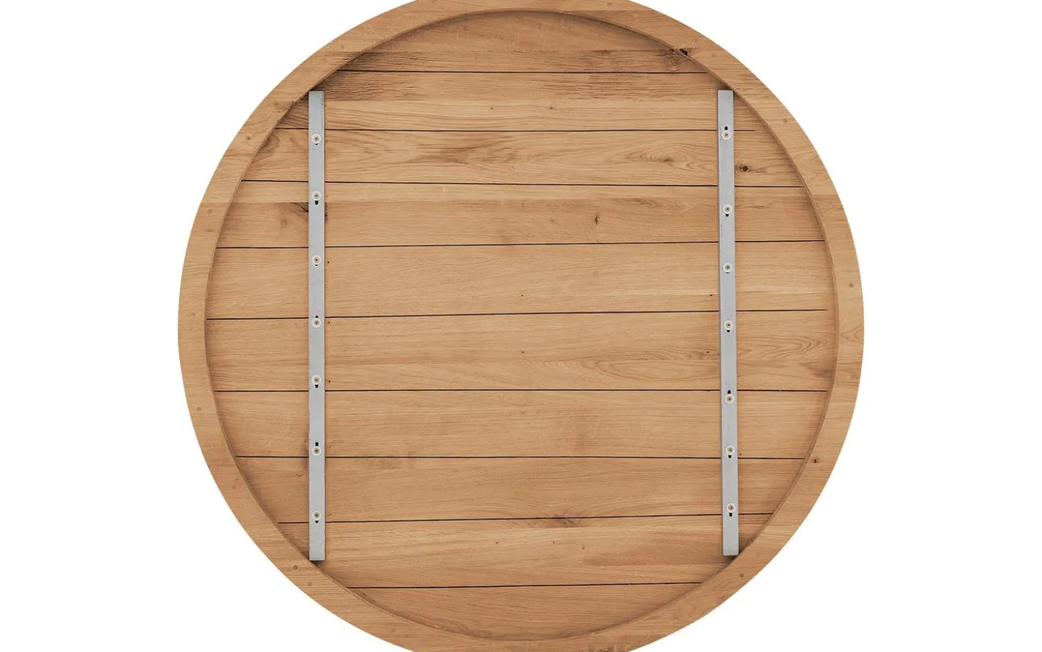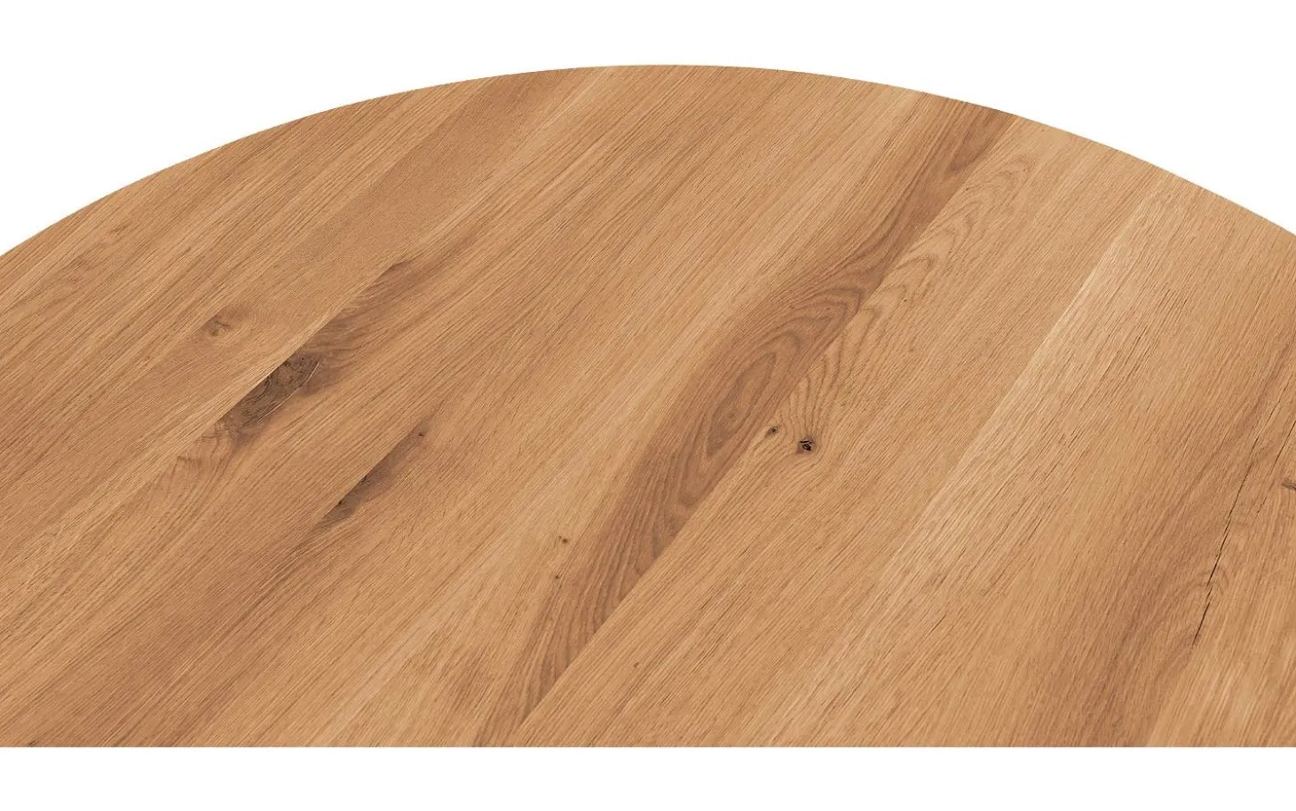Die Tischplatte ist fachmännisch aus massivem Eichenholz im Naturton gefertigt. Der Soft-Touch-Lack bewahrt die natürliche matte Ausstrahlung und schützt vor Kratzern und Ringen. Dank der geraden Kantenverarbeitung erhält die Platte einen klaren, zeitlosen Look.
