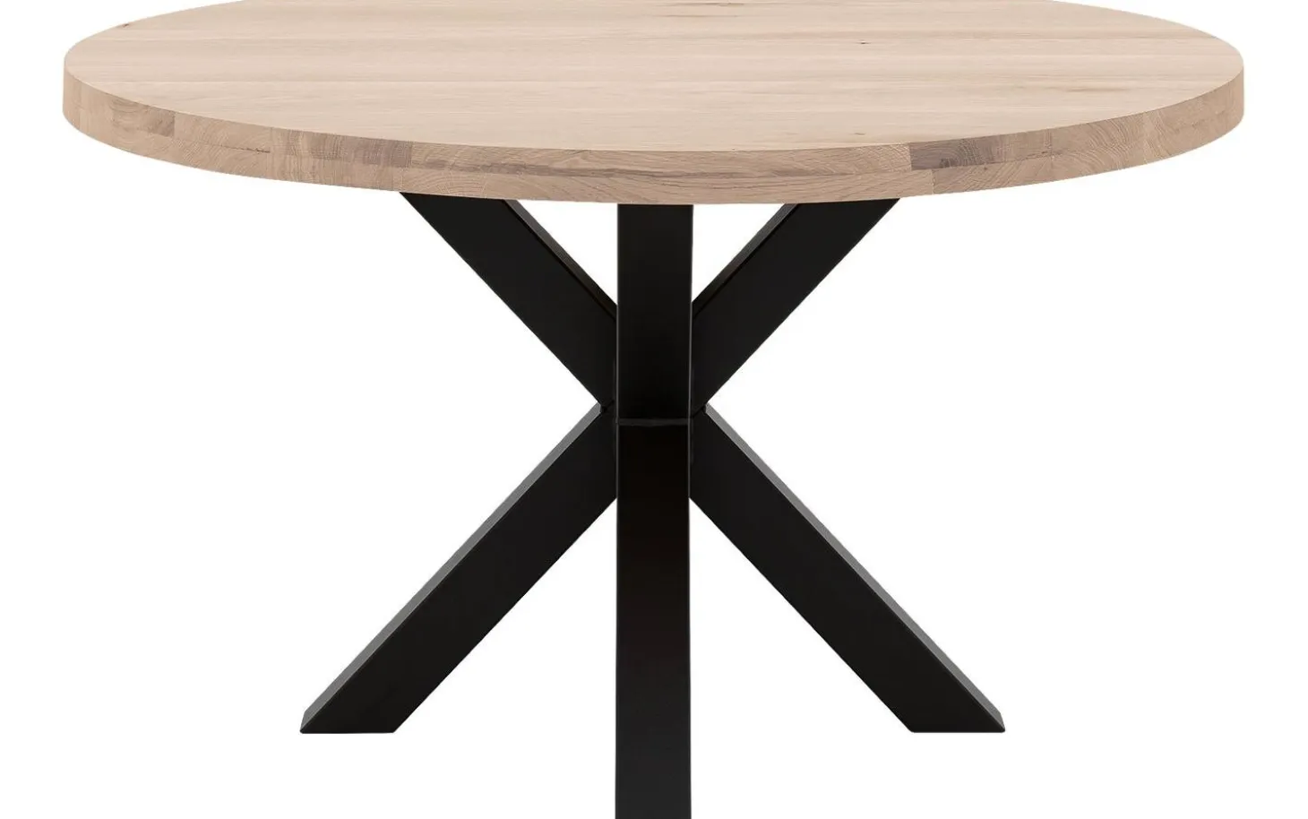 Der Esstisch Blade hat eine runde Form, die das Tafeln besonders gemütlich macht. Der auffällige Kreuzfuß aus schwarzem Metall verleiht dem Tisch eine robuste, industrielle Ausstrahlung. Die Kombination aus weißem Eichenholz und schwarzem Metall sorgt für einen modernen Touch mit natürlicher Wärme.