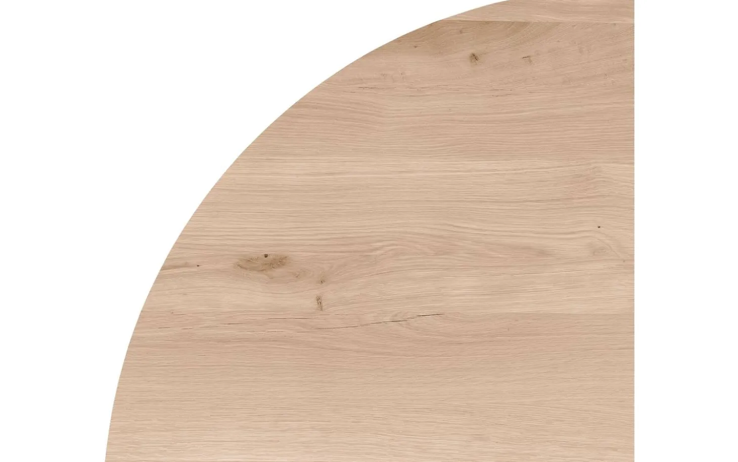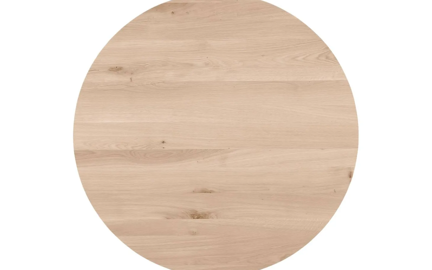 Die runde Platte ist aus solidem Eichenholz mit einer White-Wash-Veredelung gefertigt. Der Soft-Touch-Lack schützt vor Kratzern und Wasser, während die natürliche Maserung sichtbar bleibt. Die Platte hat eine Dicke von 6 cm mit gerader Tischkante für einen straffen Look.
