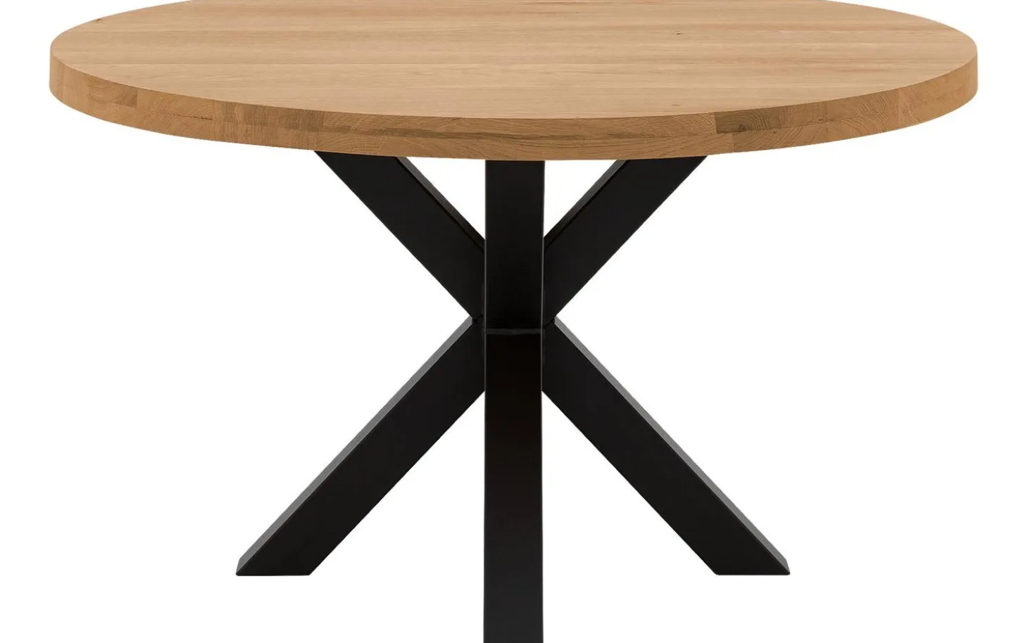 Esstisch Blade hat eine runde Form, die perfekt zu einem urban industriellen Stil passt. Das Kreuzfußgestell aus schwarzem Metall verleiht dem Tisch Charakter, während die helle Eichenholzplatte für Wärme sorgt. Ideal für gemütliches Tafeln mit der Familie.