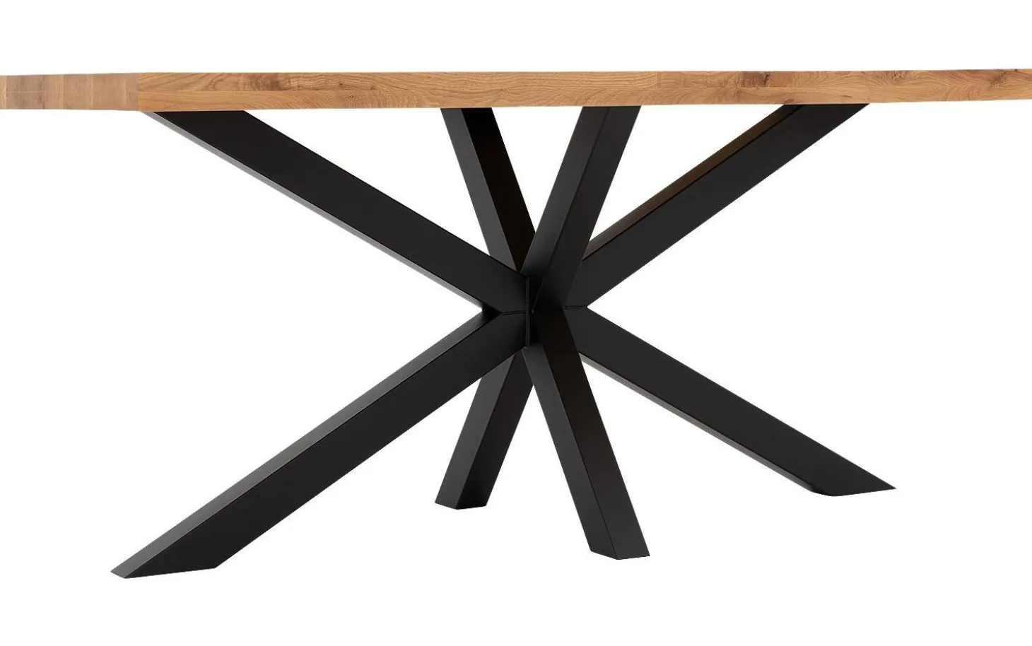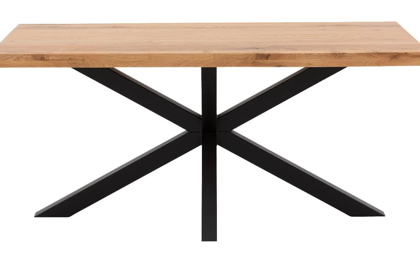 Esstisch Blade hat eine klare rechteckige Form mit einem auffälligen Kreuzgestell aus schwarz pulverbeschichtetem Metall. Die Kombination der hellen Eichenholzplatte und des schwarzen Untergestells sorgt für eine robuste, industrielle Ausstrahlung, die zu fast jedem Wohnstil passt.