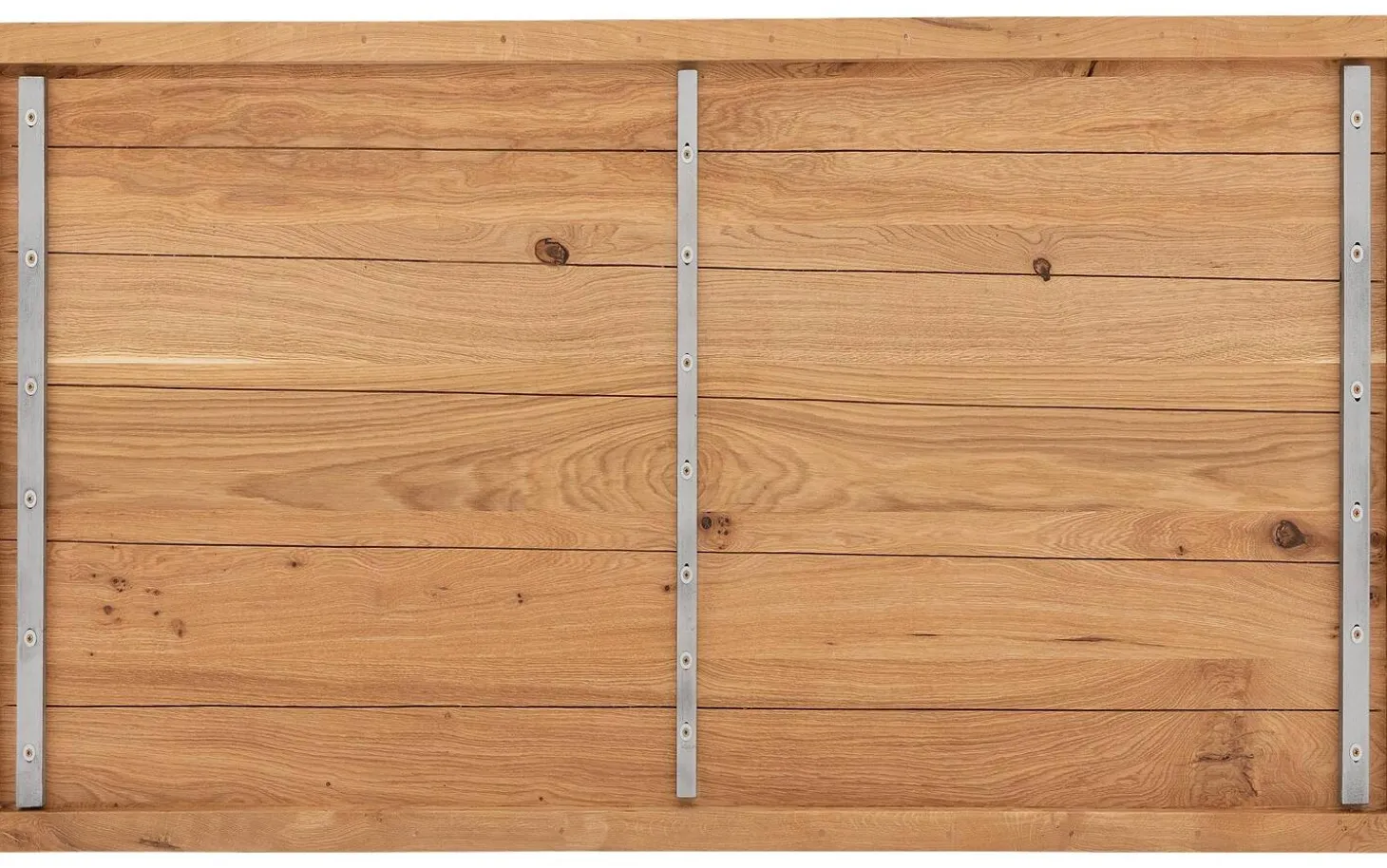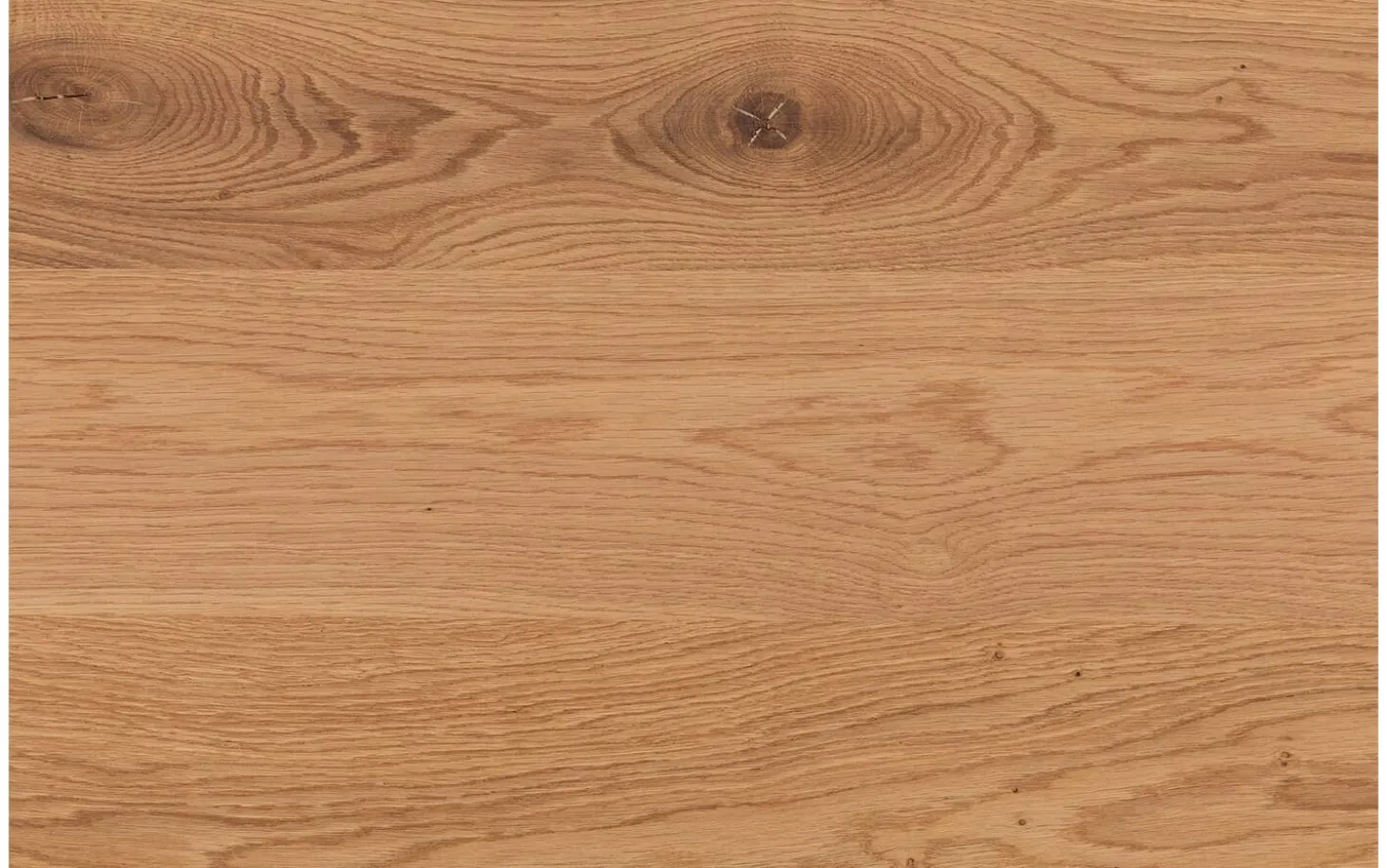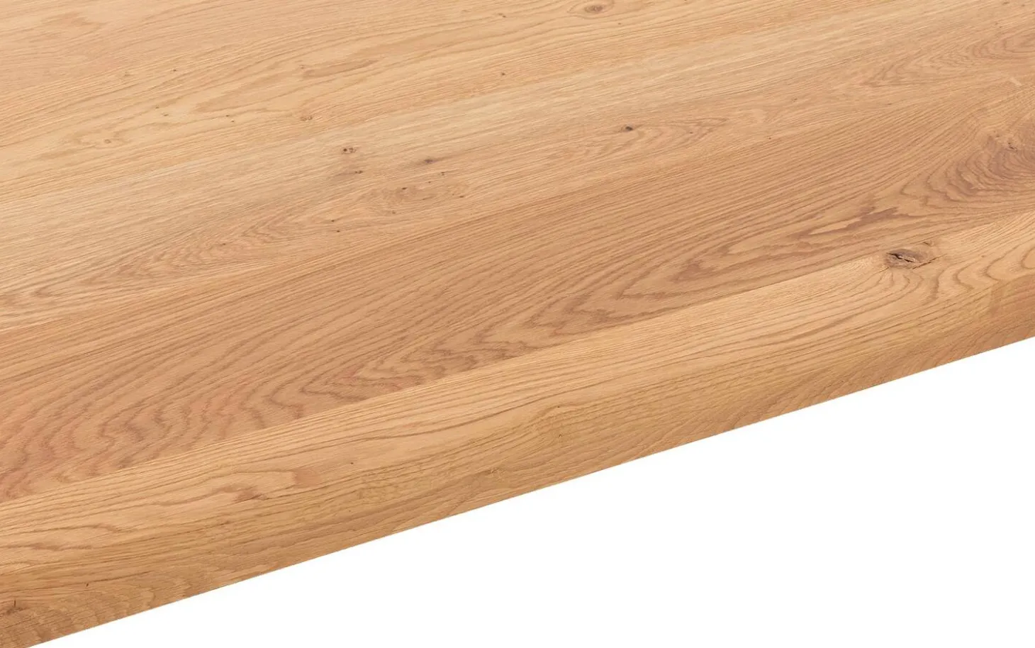 Die helle Eichenholz-Tischplatte ist mit Soft-Touch-Lack veredelt, wodurch die natürliche matte Ausstrahlung erhalten bleibt. Die Maserung bleibt sichtbar und fühlbar, während der Lack vor Kratzern und Ringen schützt. Das gerade Tischblatt hat eine Dicke von 6 cm und eine klare Kantenverarbeitung.