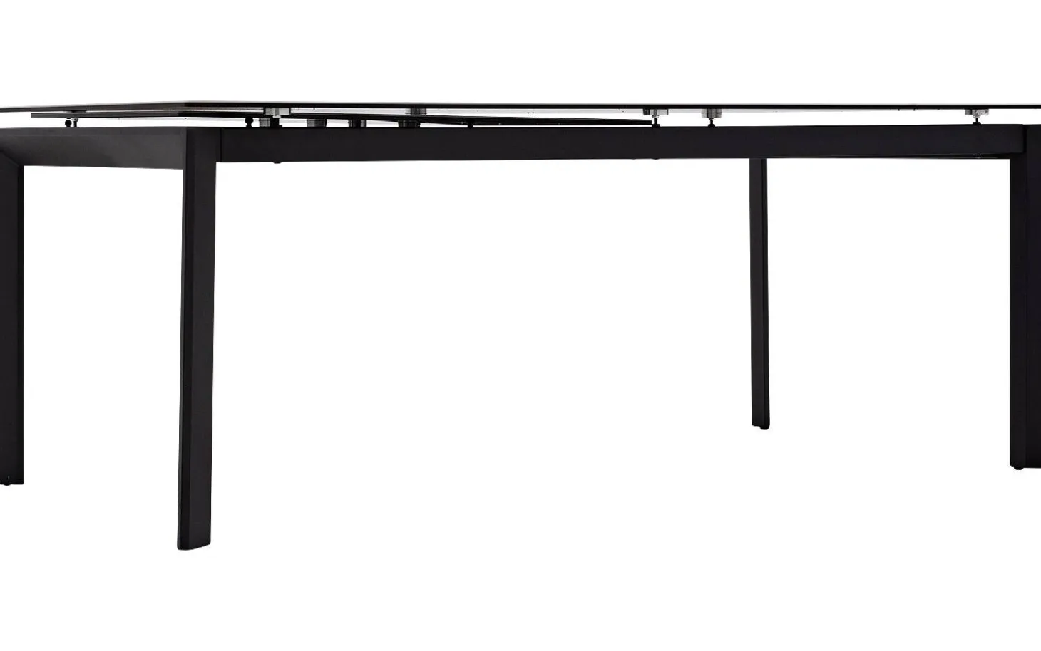 Das schwarze Metallgestell mit rechteckigem Fuß sorgt für Stabilität und einen schlanken Look. Mit 184 cm Abstand zwischen den Füßen haben Sie optimale Beinfreiheit, auch wenn der Tisch ausgezogen ist.