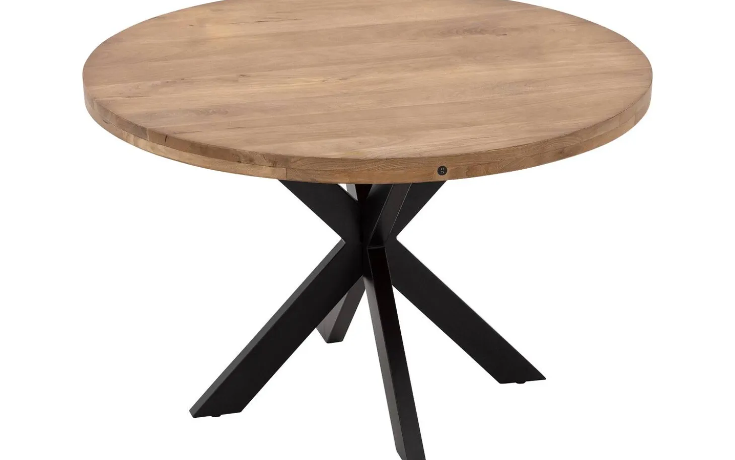 Eettafel Lecce heeft een ronde vorm die uitnodigt tot contact en verbinding. Met een diameter van 120 cm biedt de tafel ruimte voor 4 personen. De kruispoot van zwart gepoedercoat metaal vormt een krachtige basis. Het mangohouten blad in natuurlijke houtkleur met gelakte afwerking geeft het geheel warmte en karakter.
