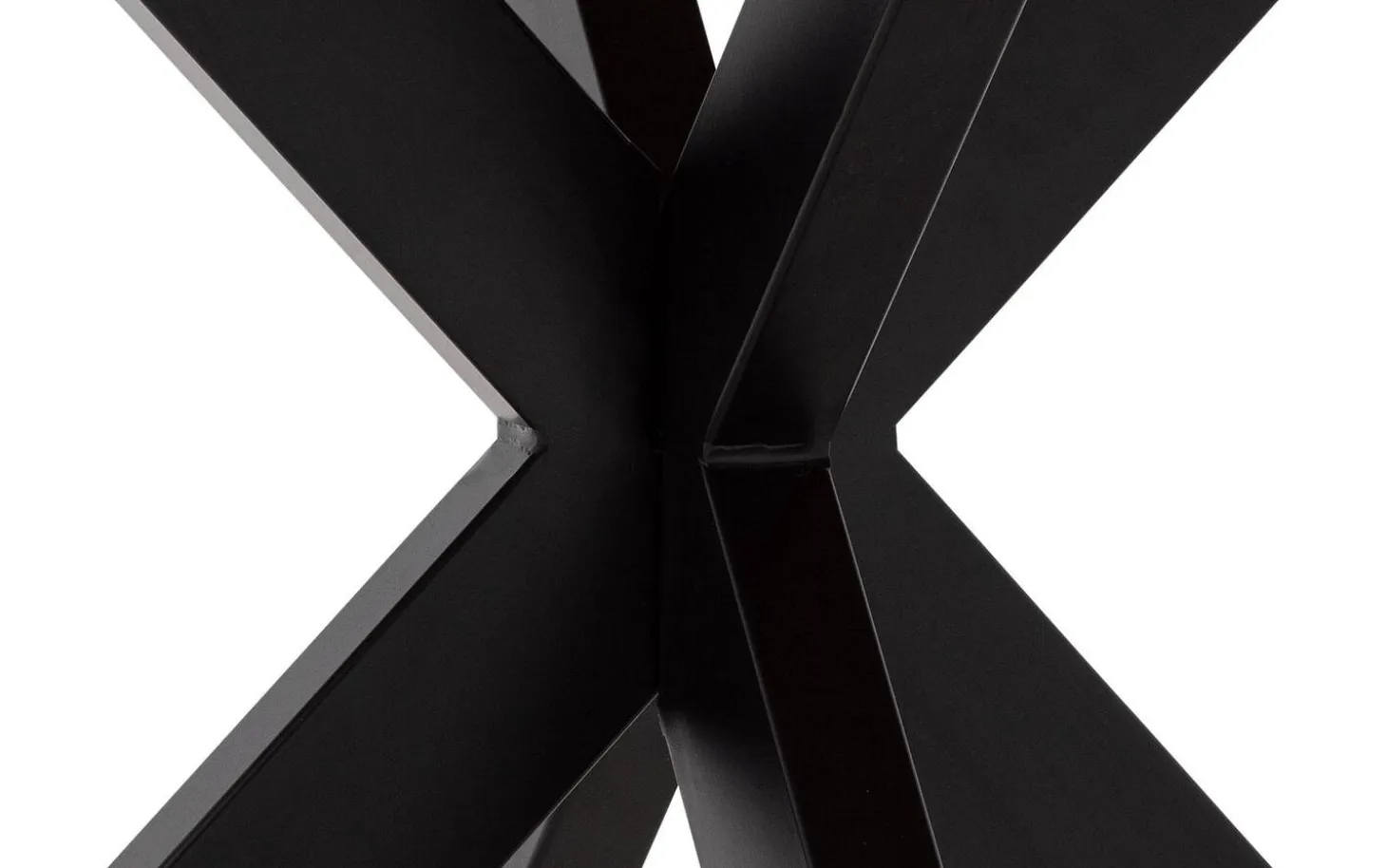Het onderstel met kruispoot van zwart metaal zorgt voor een stevige en eigentijdse basis. Door de slimme plaatsing van de poot blijft er voldoende beenruimte over, wat het zitcomfort verhoogt. Het contrast tussen de warme houtkleur en het zwarte metaal zorgt voor een mooie balans in je eetkamer.
