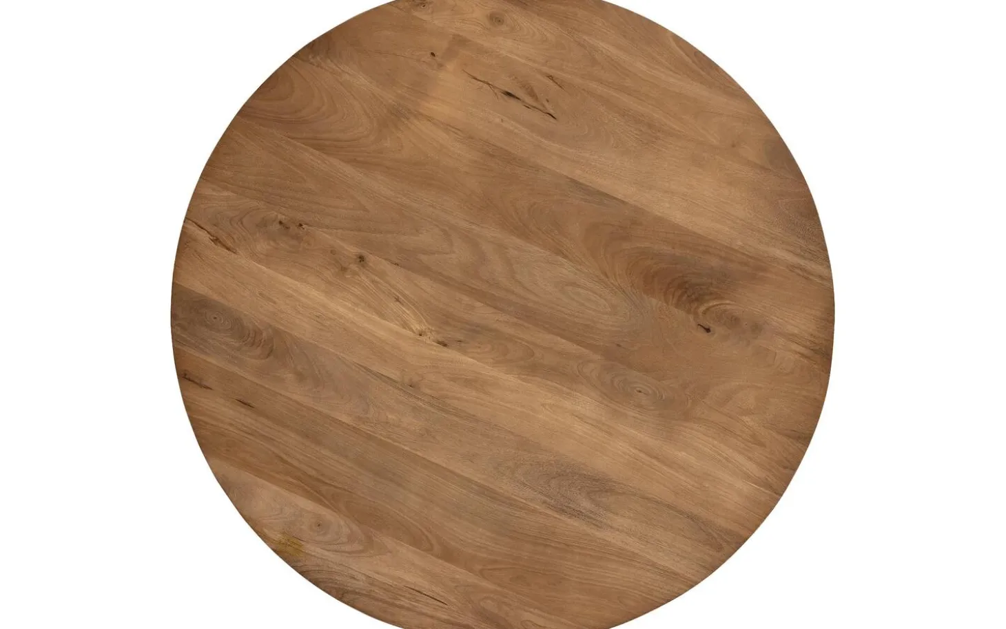 Het tafelblad van mangohout is afgewerkt met een transparante laklaag die de natuurlijke houtkleur en nerven mooi behoudt. De gelakte afwerking beschermt het hout en maakt onderhoud eenvoudig. De ronde vorm met zachte ronding maakt de tafel uitnodigend en comfortabel.