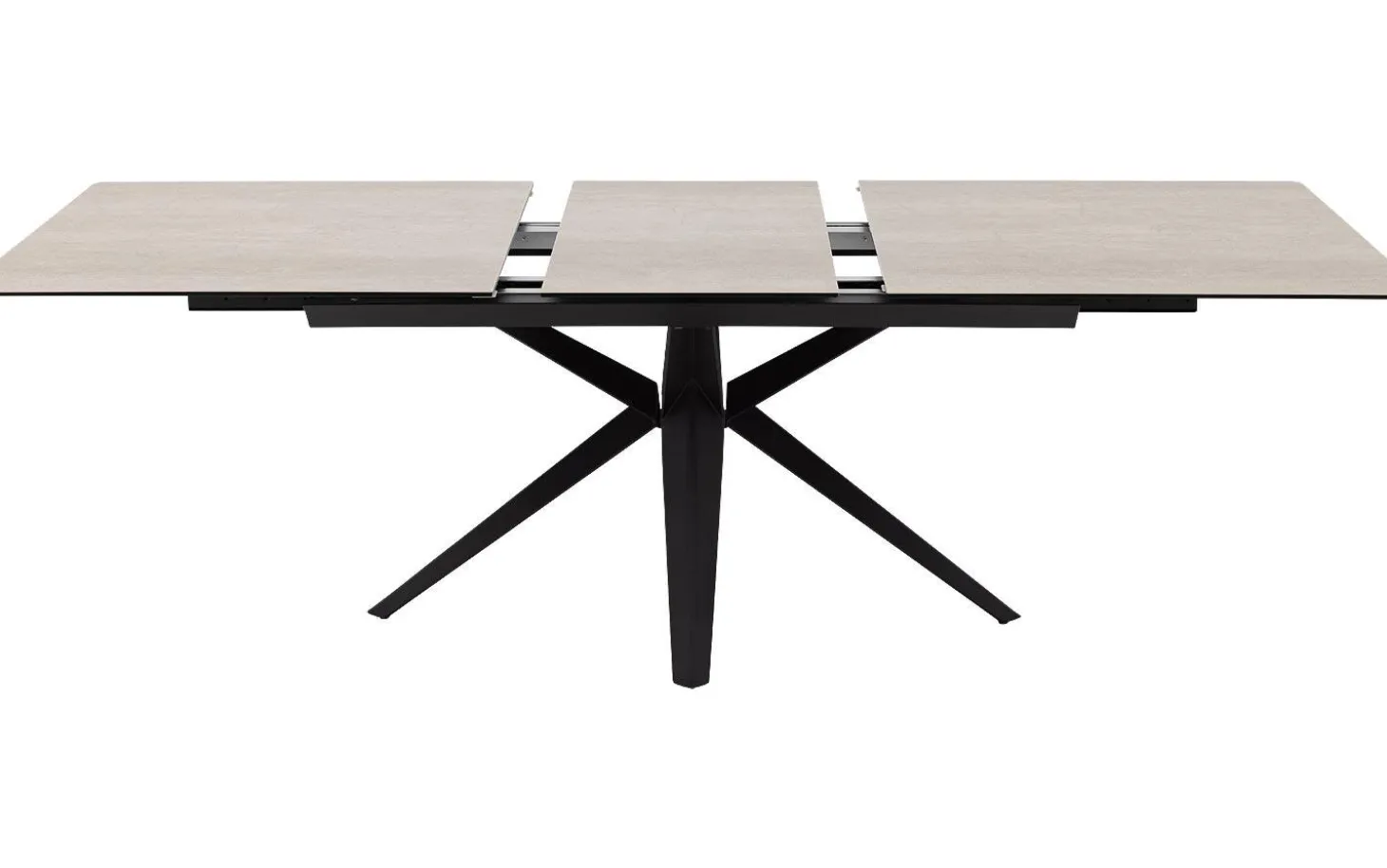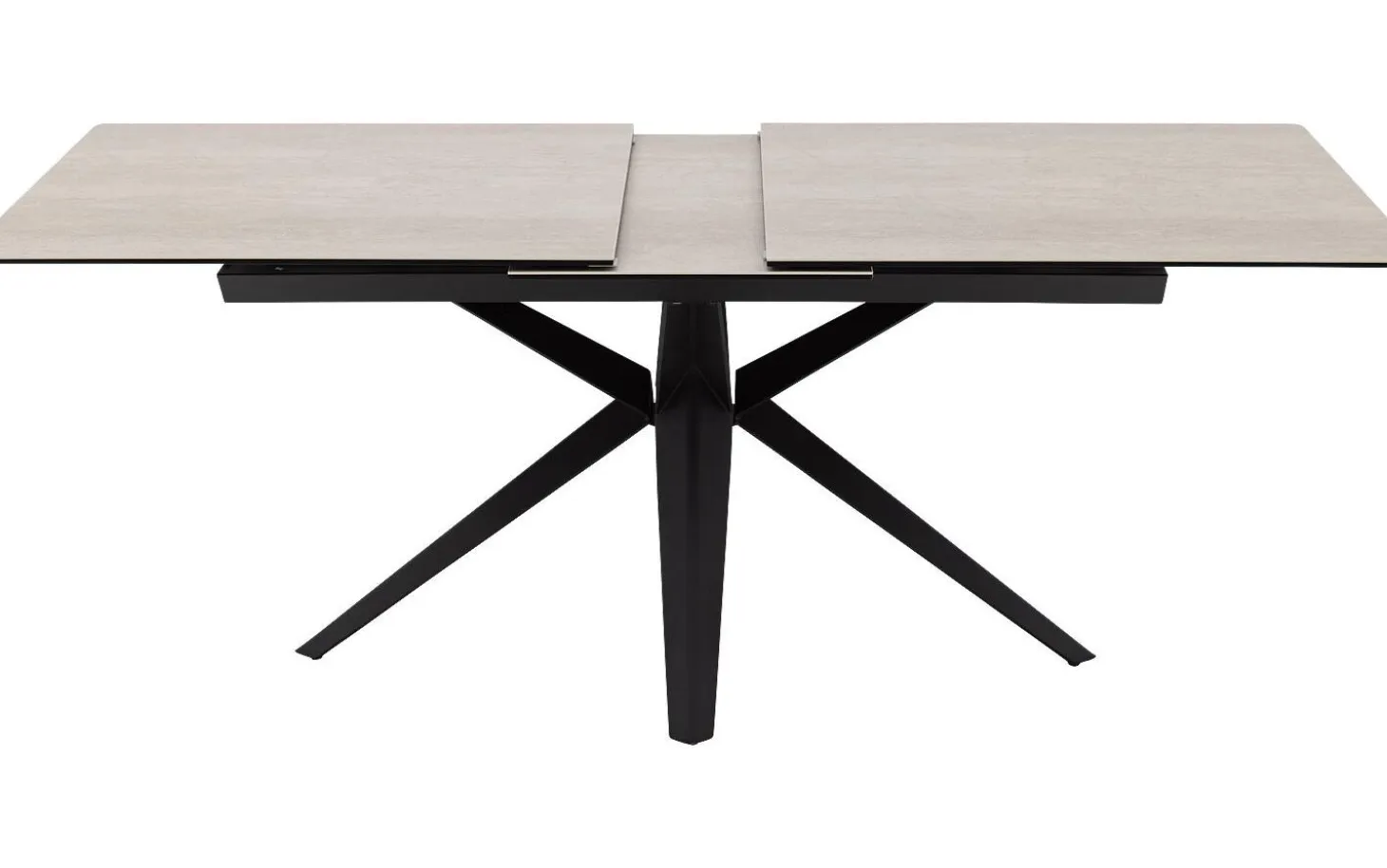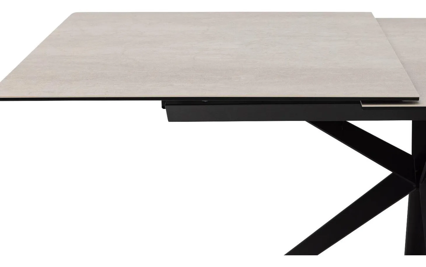 Das Kreuzgestell aus schwarzem Metall sorgt nicht nur für Stabilität, sondern verleiht auch dem Ganzen Charakter. Das Ausziehsystem funktioniert reibungslos und vergrößert den Tisch um 50 Zentimeter – so haben Sie immer genug Platz am Tisch.