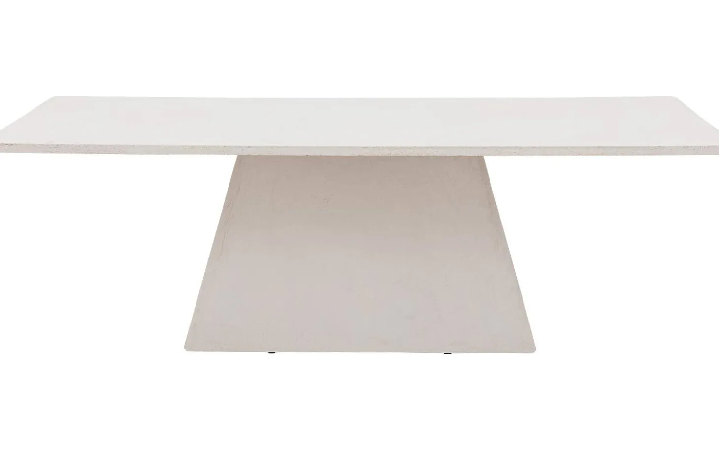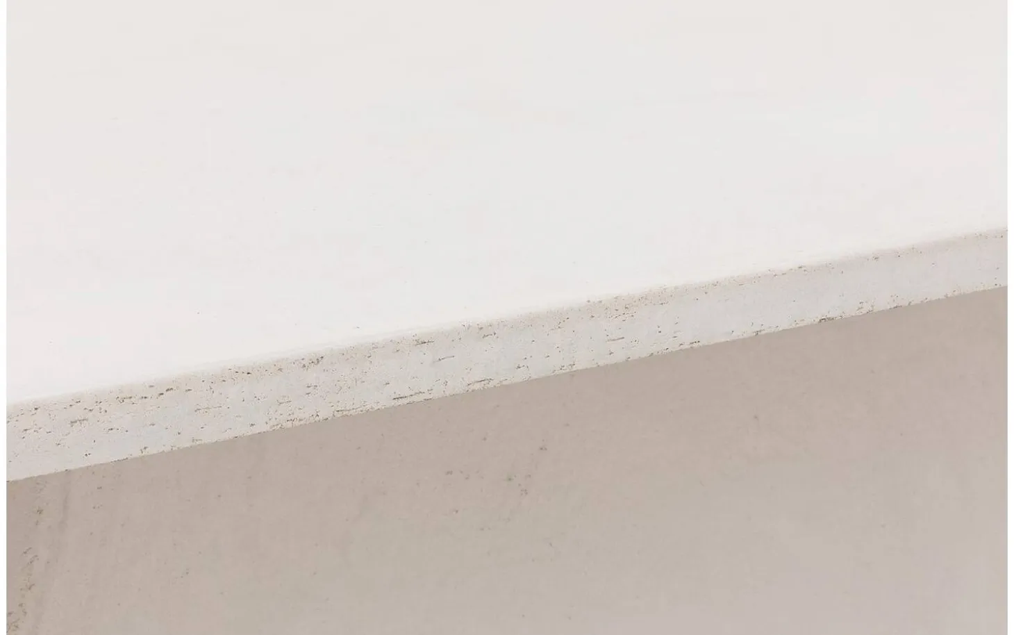 Die weiße Tischplatte hat eine authentische Betonoptik mit leichten Unregelmäßigkeiten wie kleine Poren und eine geflammte Struktur. Diese natürlichen Variationen verstärken den industriellen Charakter. Die gerade Kantenverarbeitung hält die Ausstrahlung straff und zeitlos.