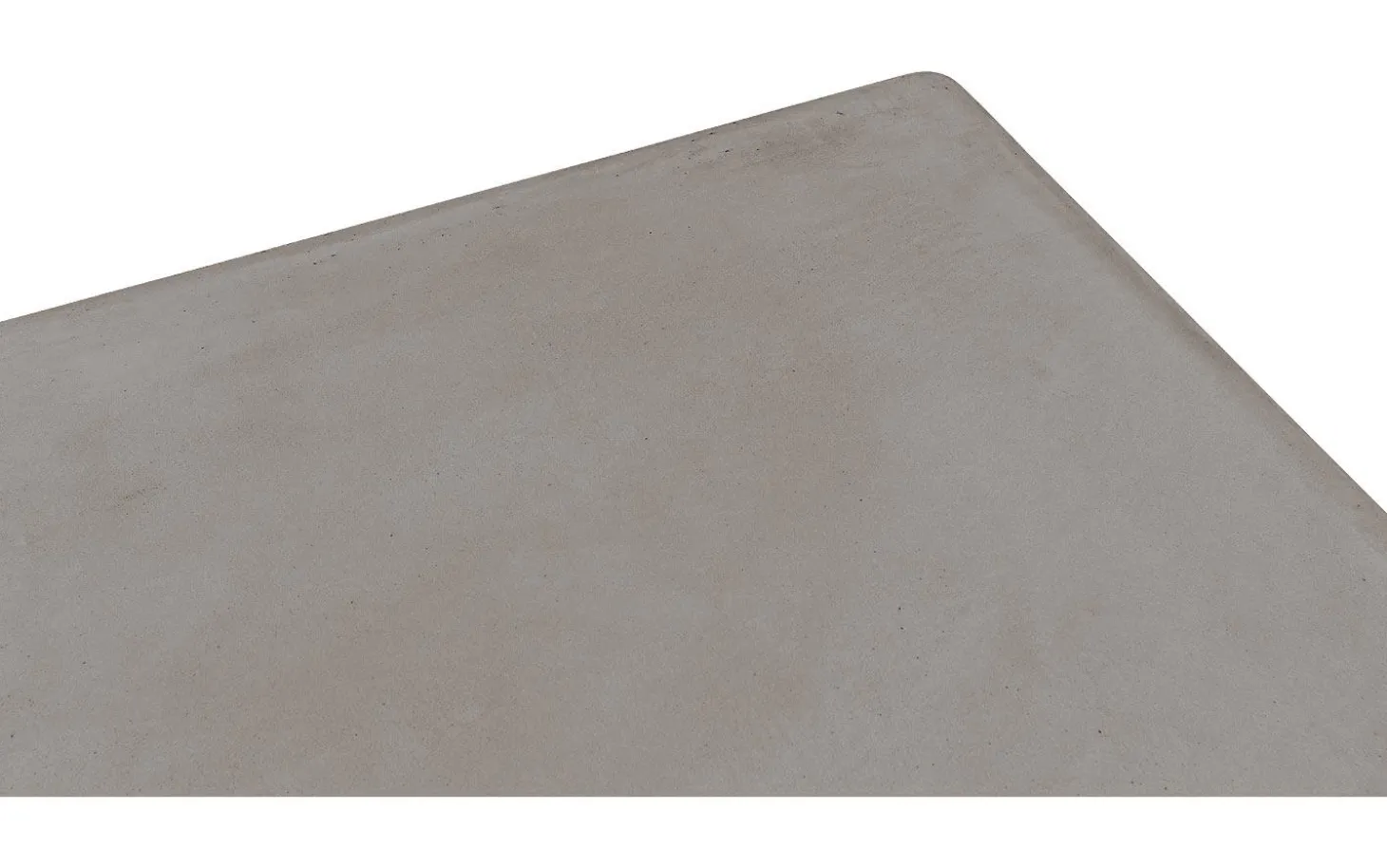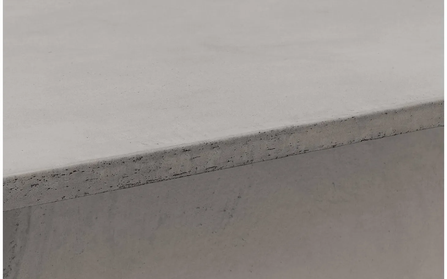 Die graue Tischplatte ist aus MDF mit einer dünnen Betonschicht in Charquel-Farbe gefertigt. Diese Betonoptik hat natürliche Unregelmäßigkeiten wie kleine Löcher und Risse, die die industrielle Ausstrahlung verstärken. Die gerade Kantenverarbeitung hält das Design straff und zeitlos.