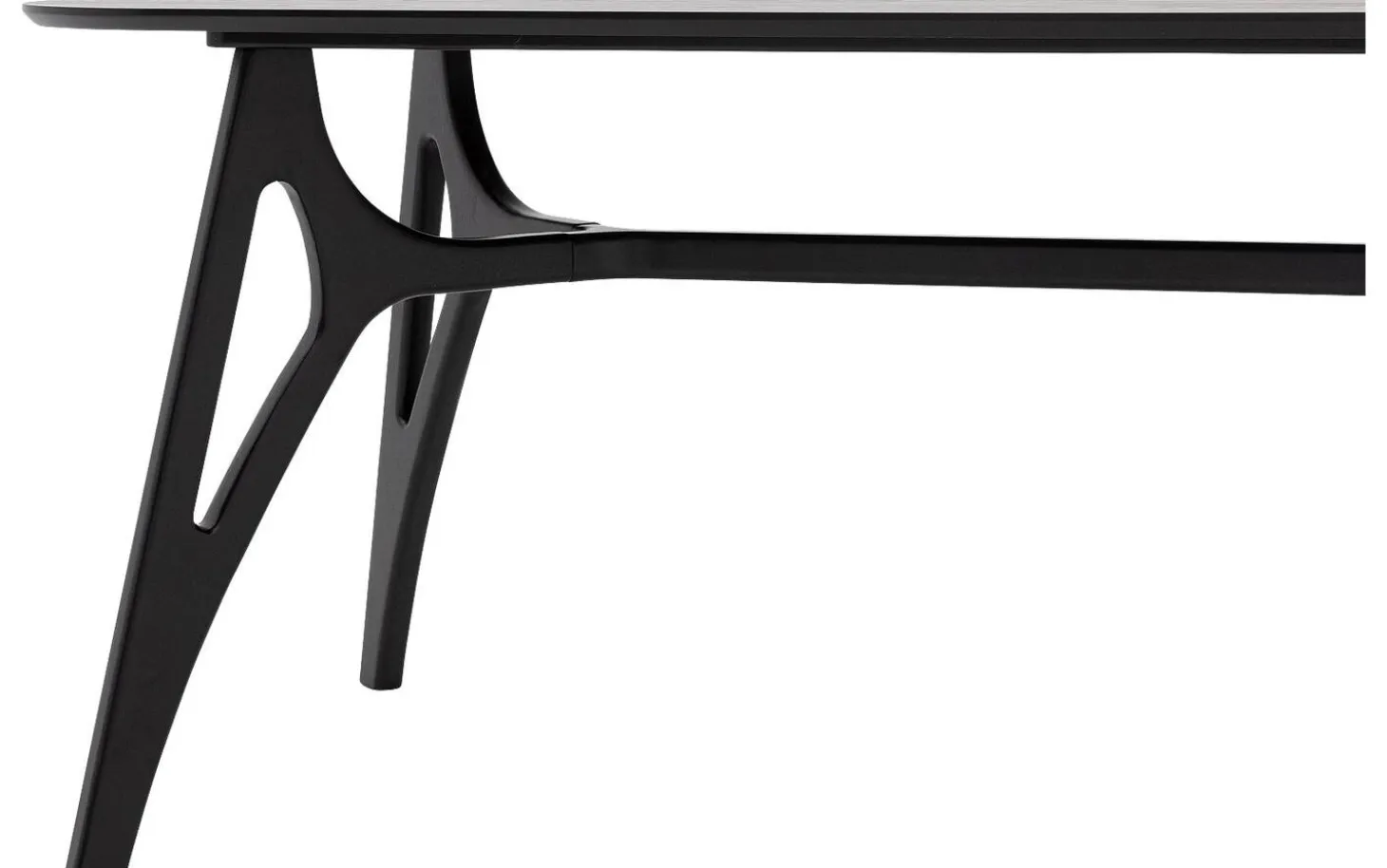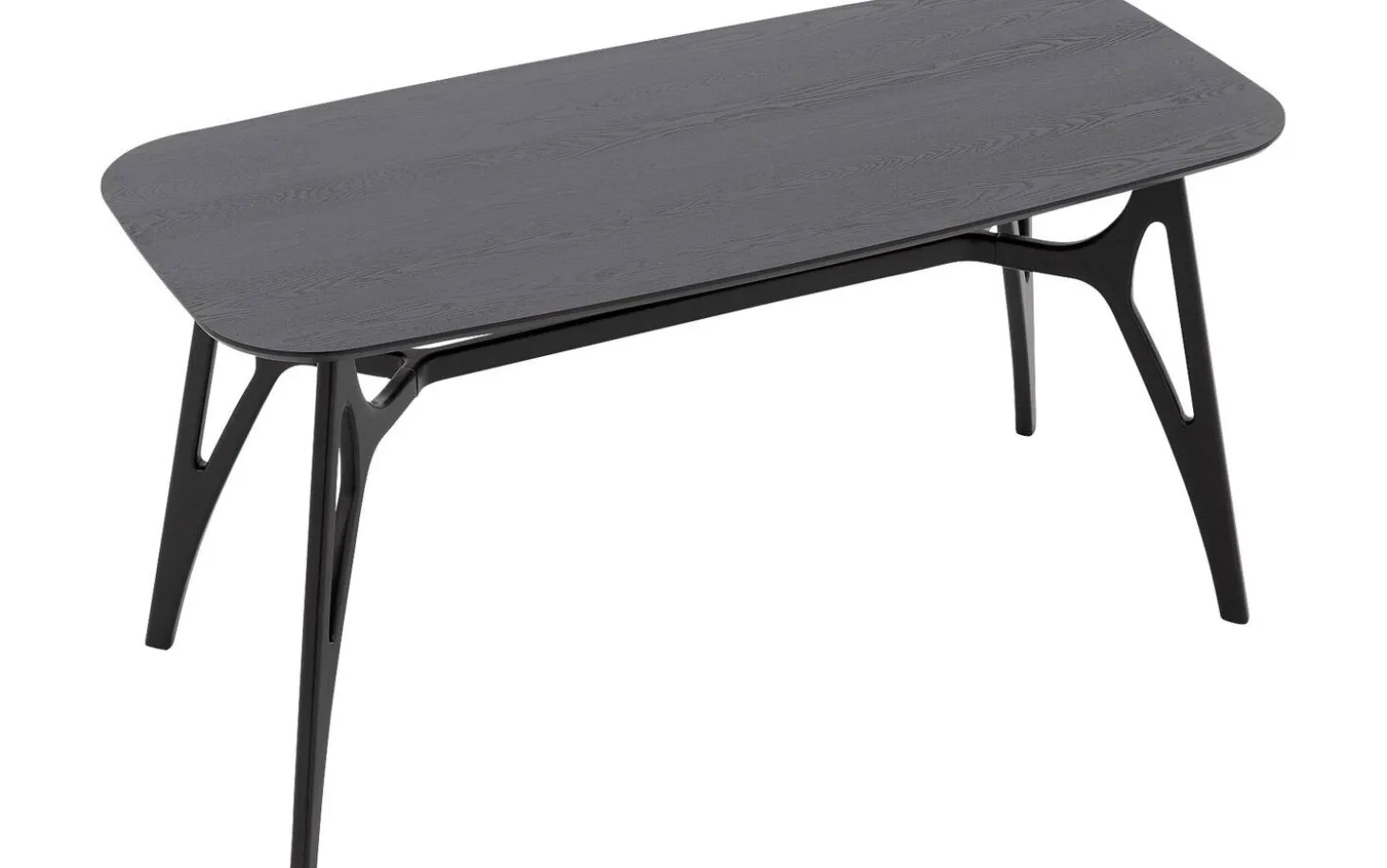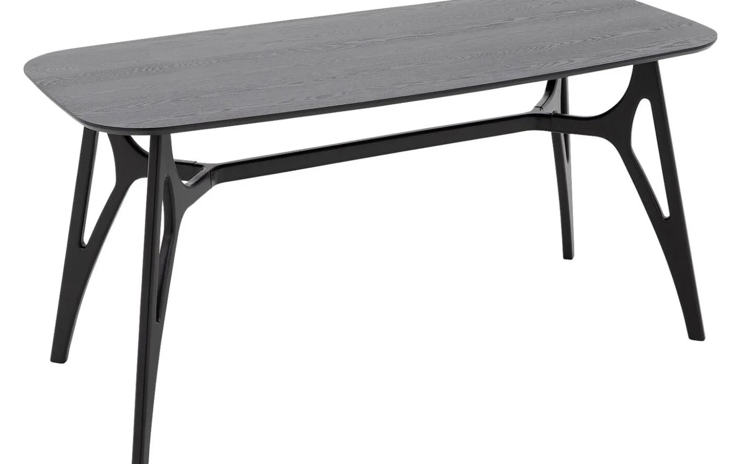 Die Tischplatte aus Eschenholz ist mit einer schwarzen Lackschicht veredelt, die Schutz vor Flecken und Ringen bietet. Der natürliche Holzcharakter bleibt unter der lackierten Oberfläche schön sichtbar. Die rechteckige Form mit geraden Kanten sorgt für eine moderne, zeitlose Ausstrahlung.